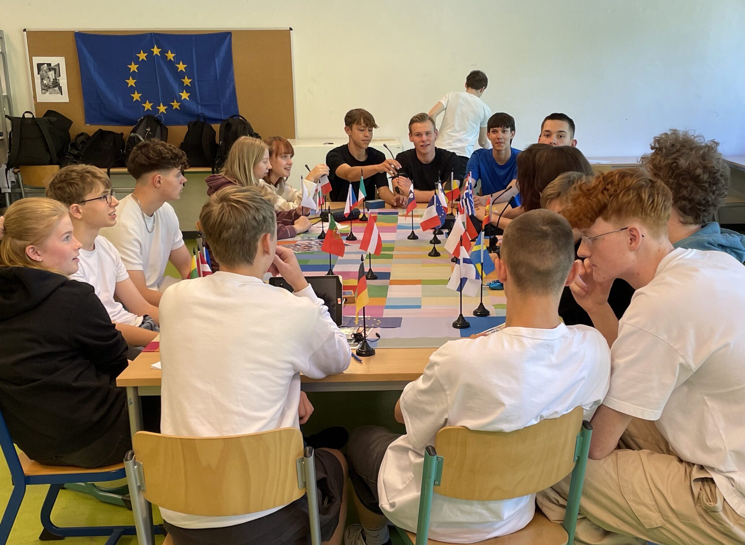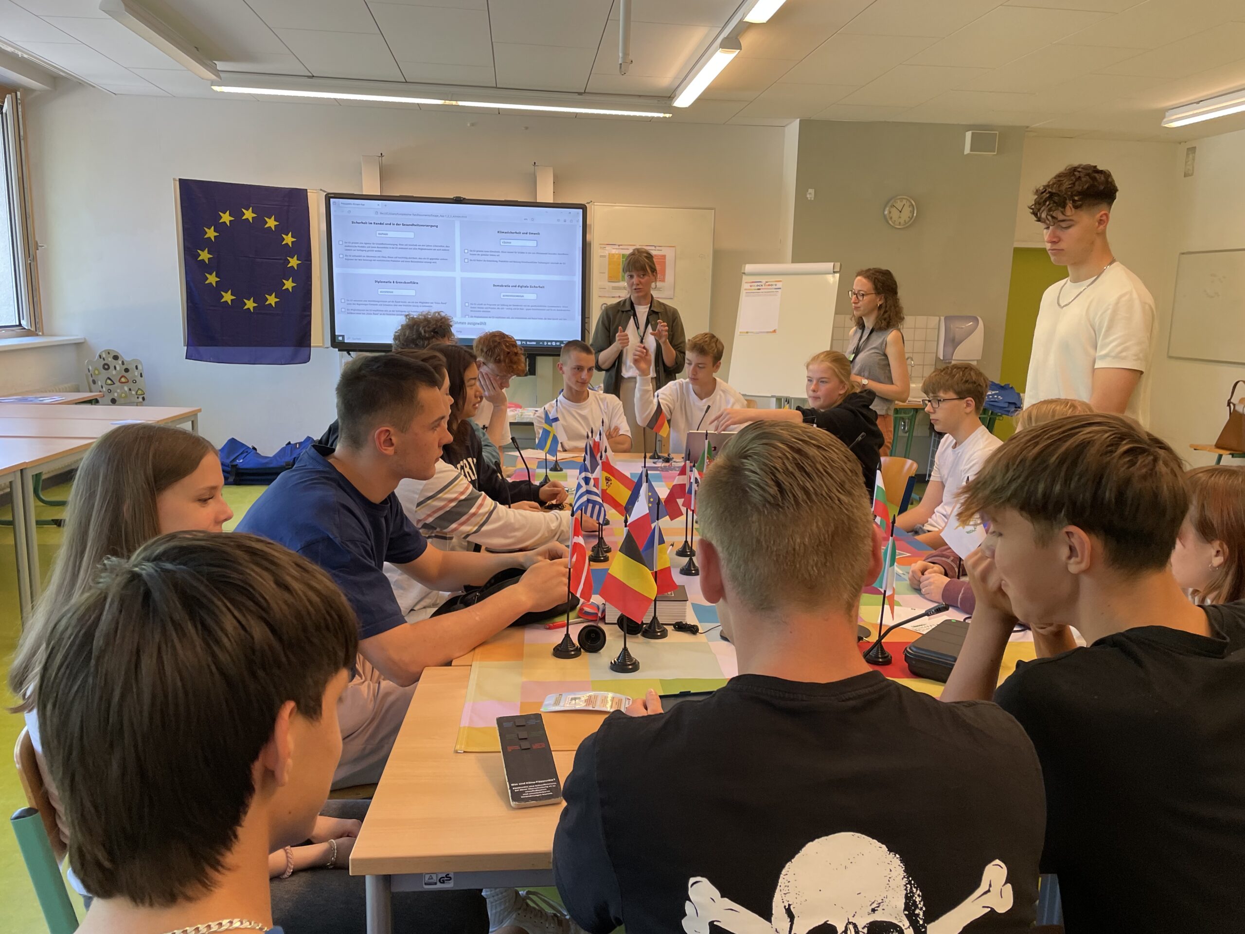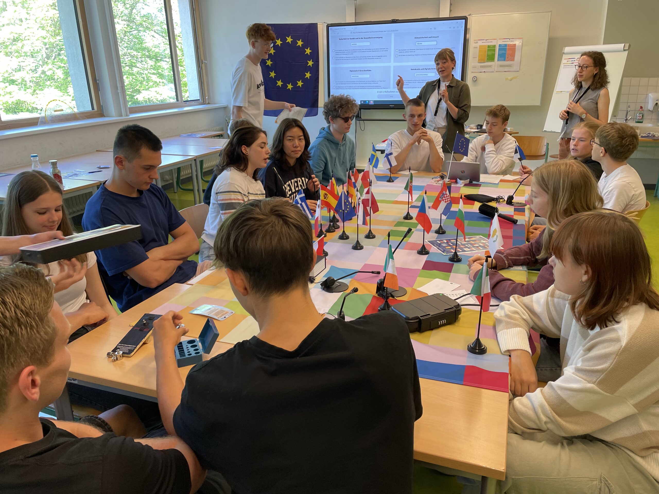 Auf spielerische Weise lernten die Jugendlichen die EU als Friedensprojekt, Wertegemeinschaft und Sicherheitsgarantin kennen. Sie erlebten, wie vielschichtig zum einen die Arbeit und Bedeutung der europäischen Staatengemeinschaft ist und für welche Werte und Überzeugungen sie steht. Zum anderen erfuhren sie, dass auch wirtschaftlicher Wohlstand, die Versorgung mit lebenswichtigen Gütern, medizinische Hilfe und eine lebenswerte Umwelt für Frieden und Sicherheit notwendig sind. Und sie haben verstanden, wie wichtig es ist, auch bei gegenteiligen Interessen konstruktiv zusammen zu arbeiten, nach einer gemeinsamen Lösung zu suchen und Kompromisse auszuhandeln.