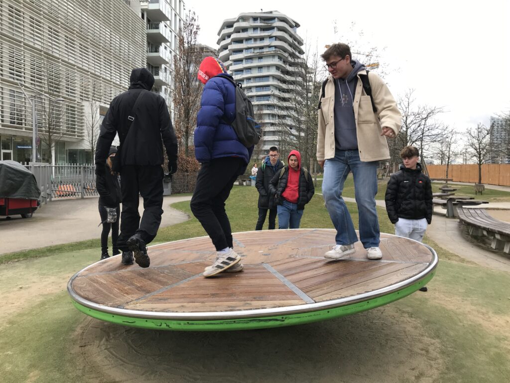 Beim Rundgang wurden unterschiedliche Funktionsräume thematisiert, hier die Grundschule und ein Spielplatz, der den Bewegungsdrang und Spieltrieb einiger weckte.