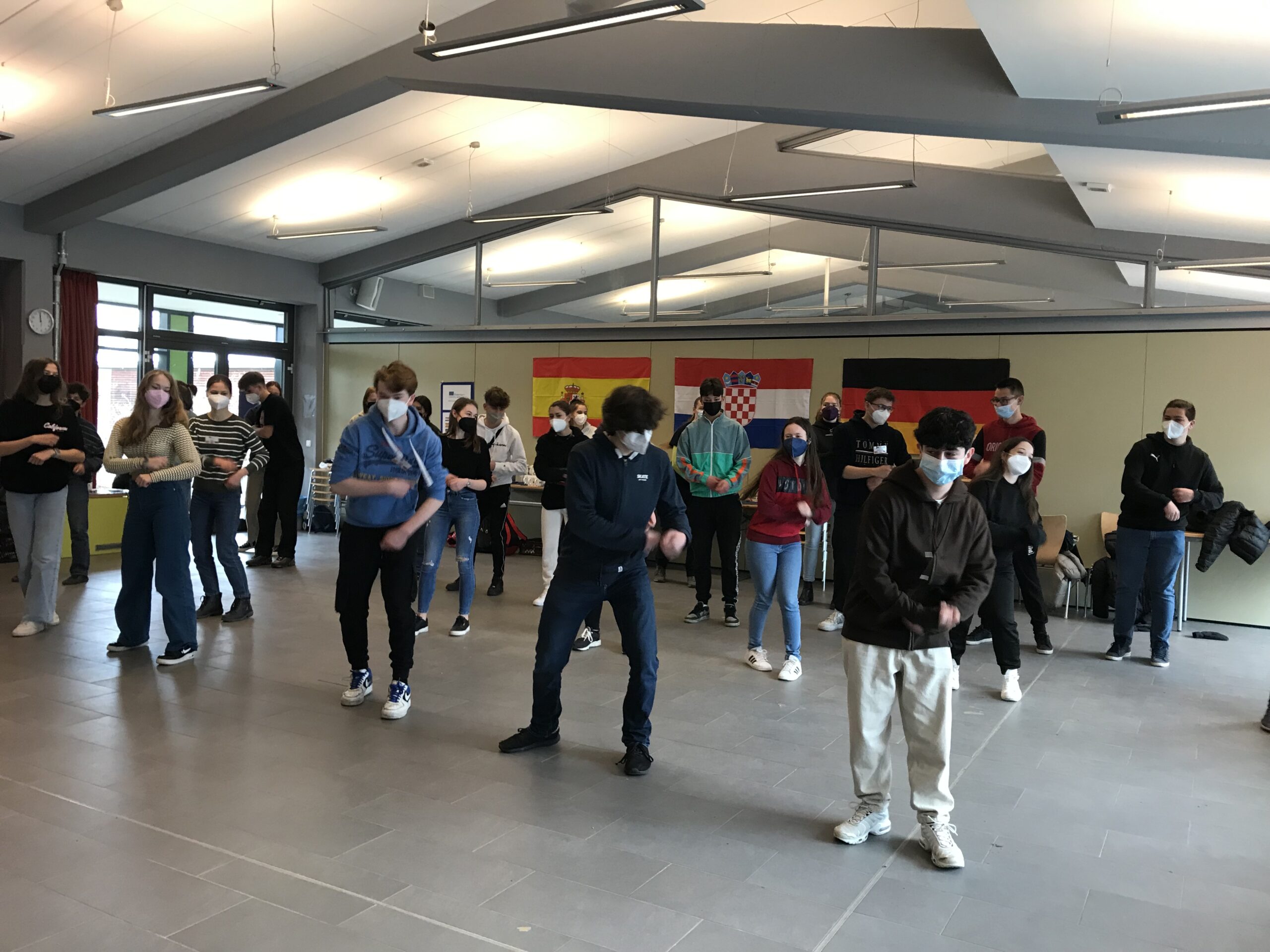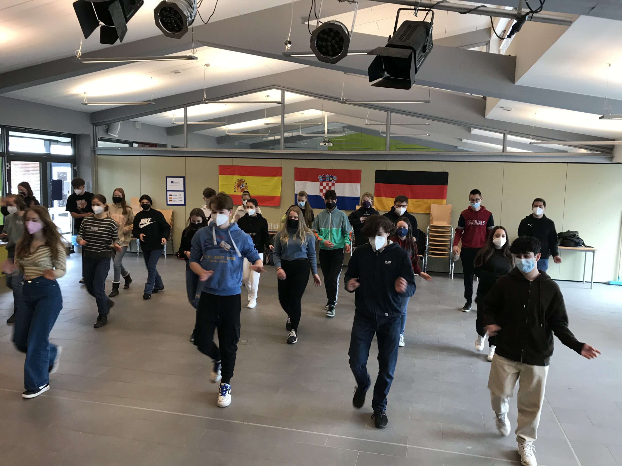 Mit der Präsentation der Architekturfilme starteten Schüler wie Lehrkräfte in den Tag. Danach leiteten einige von Kunstlehrer Ingo Bruweleit angeheuerte TMS-Schüler Gruppentänze an. In kürzester Zeit beherrschten alle die Schritte, bewegten sich synchron zur Musik und hatten richtig Spaß.