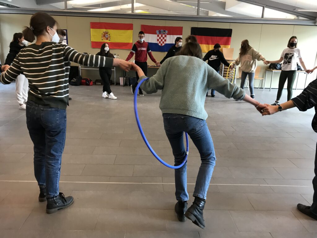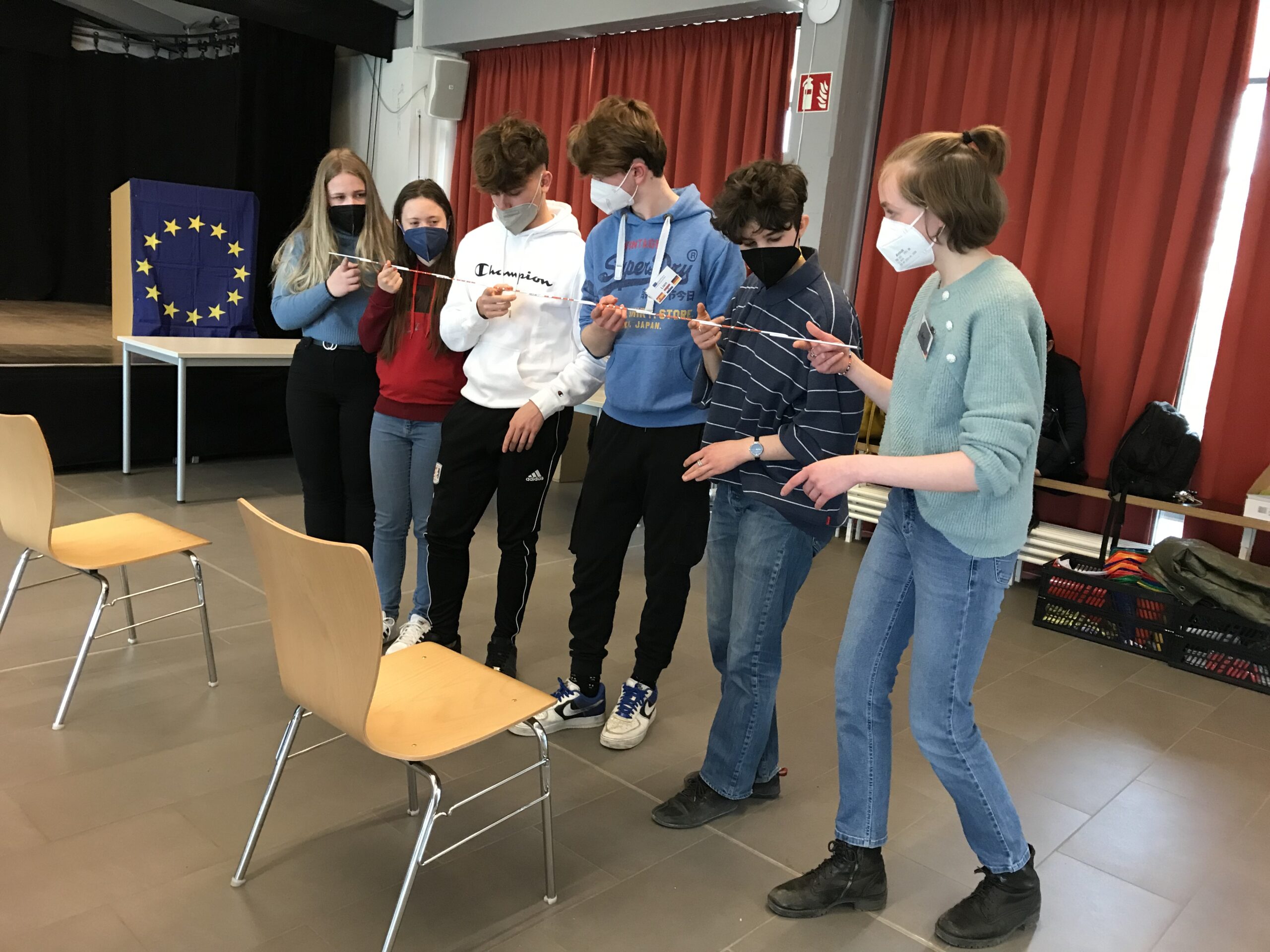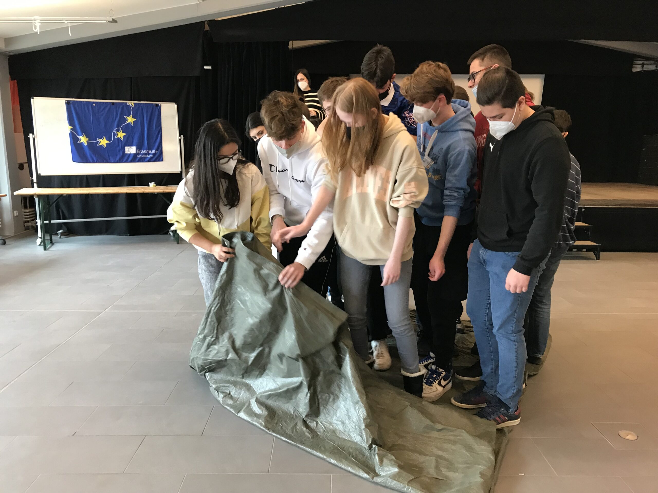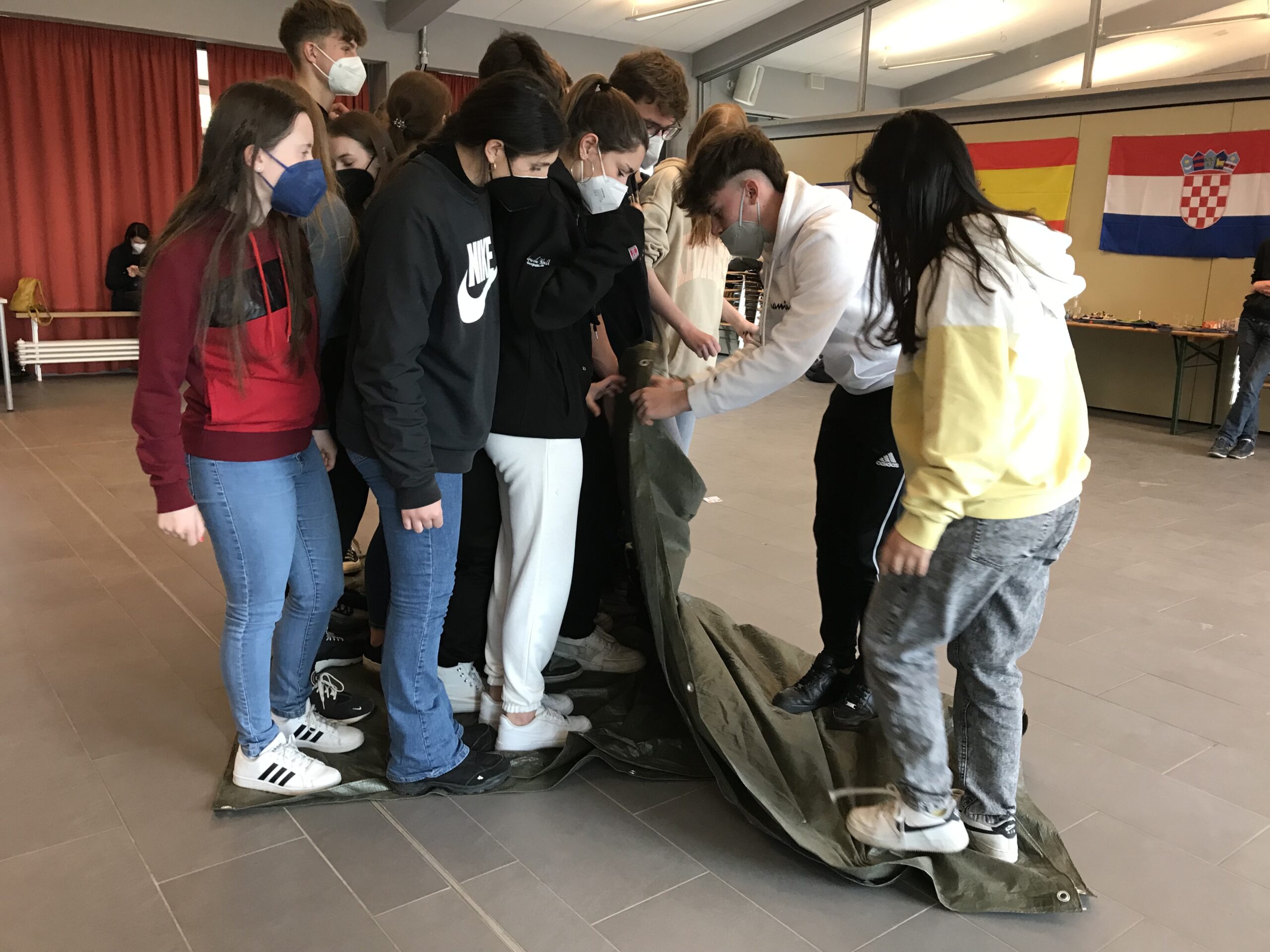 Sportlehrerin Miriam Petzold stellte danach den Schülern Bewegungsaufgaben, bei denen sie als Gruppe zusammenarbeiten mussten. Eine Plane umzudrehen, auf der man gleichzeitig steht und die man nicht verlassen darf, HoolaHoop-Reifen, die im Kreis sich an der Hand haltender Schüler weitergegeben werden mussten, ohne dass man sich loslassen durfte… Die Teilnehmer mussten Lösungen besprechen und sich auf eine Vorgehensweise einigen.