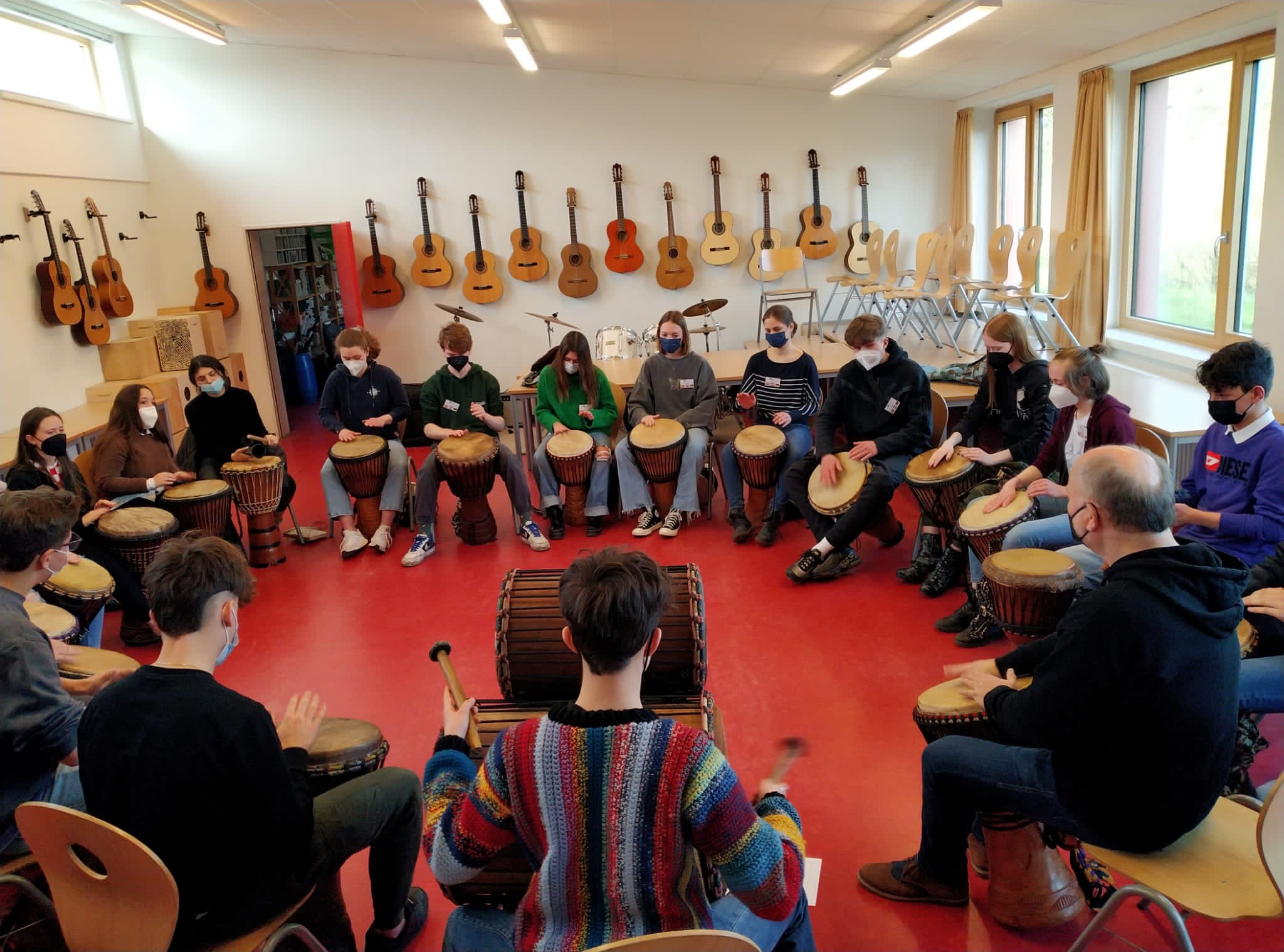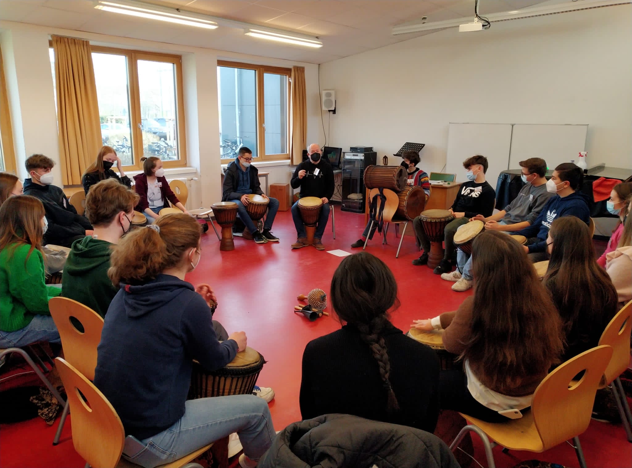 Das Warming up der Teilnehmer nach dem einleitenden Teil übernahm Musiklehrer Martin Salomon in einem Percussion-Workshop. Bereits nach einer halben Stunde hatten Gäste und Gastgeber rhythmische Muster erlernt, reagierten sensibel auf ihre Mitspieler und klappte das Zusammenspiel.