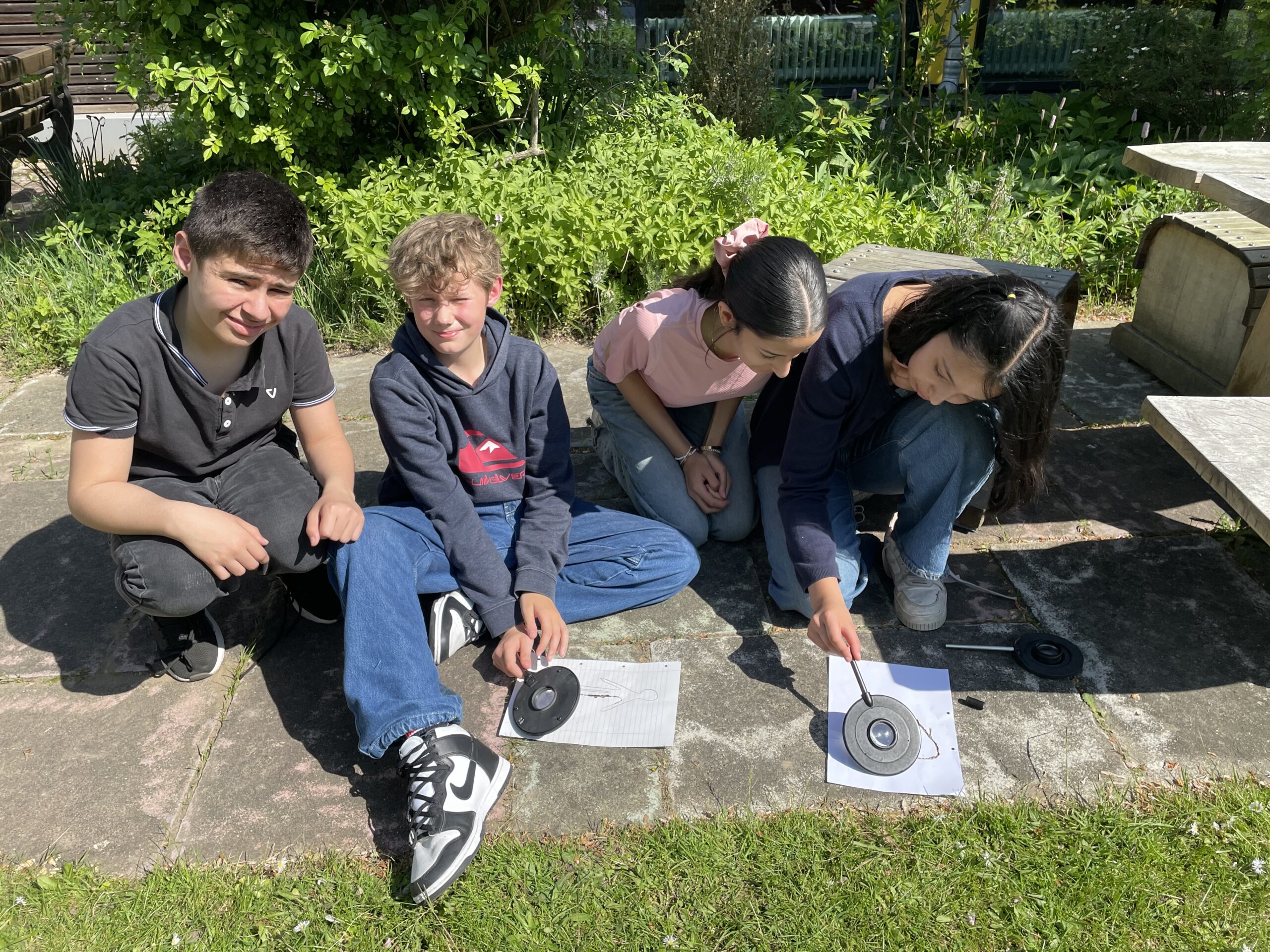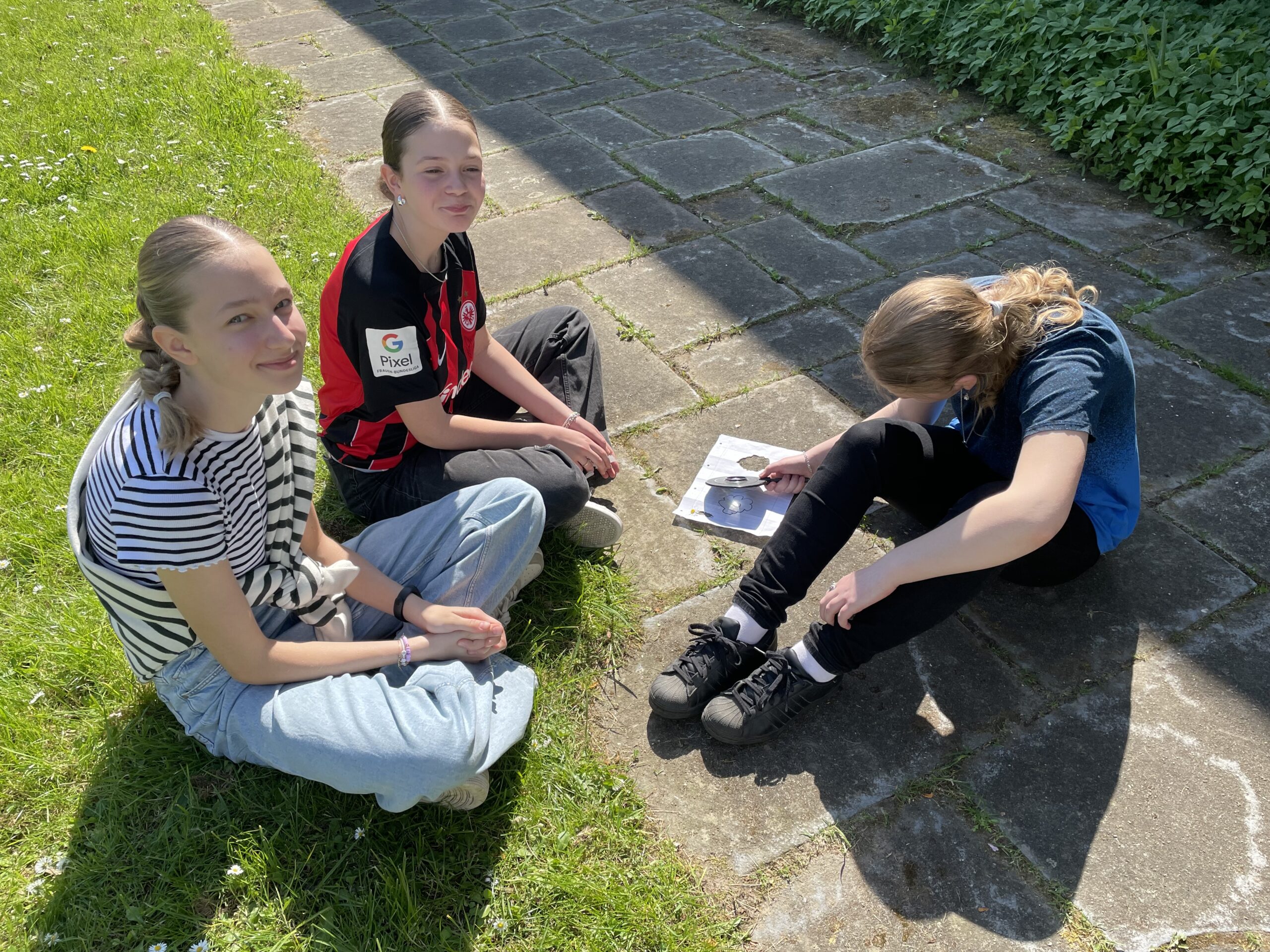 Mit Lupen ausgerüstet erforschten die Schülerinnen und Schüler der Klasse 7e mit ihrem Physiklehrer Malte Wirsch, wie man das Sonnenlicht so auf einen Punkt bündeln kann, dass ein Blatt Papier zu brennen beginnt.