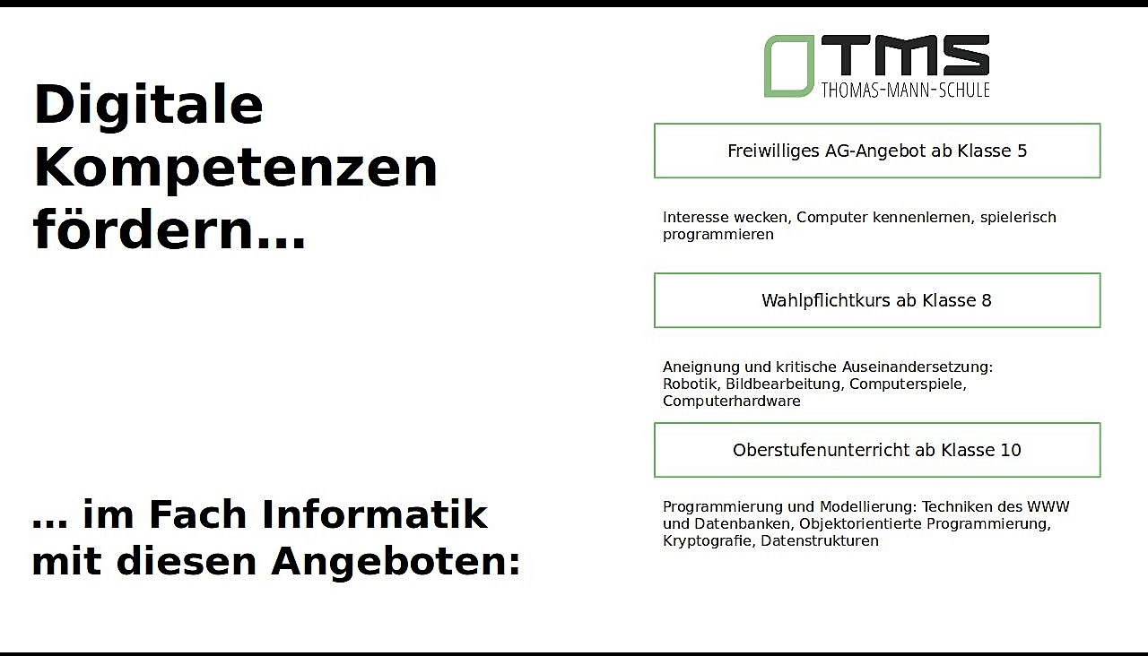 Das Informatikangebot der TMS zielt darauf ab, die Schülerinnen und Schüler möglichst früh für Informatik zu begeistern. Schon ab Klasse 5 steht ein freiwilliges AG-Angebot offen. Dabei wird spielerisch der Umgang mit Software geübt und es werden z.B. an selbst entwickelten Spielen erste Programmierkenntnisse erworben.