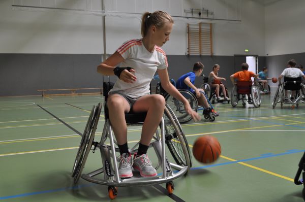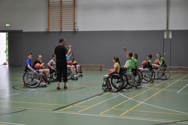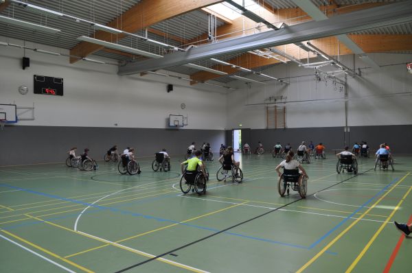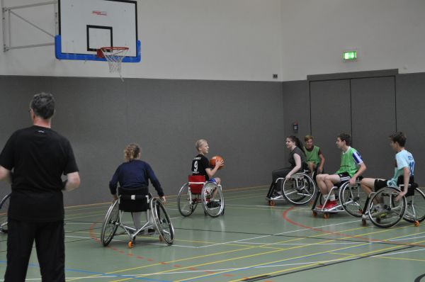 Abschließend wurde das Gelernte im Rollstuhlbasketball umgesetzt, bei dem es ordentlich zur Sache ging. Es wurde um den Ball gekämpft, gesprintet, gestoppt, Wege versperrt und Körbe erzielt.