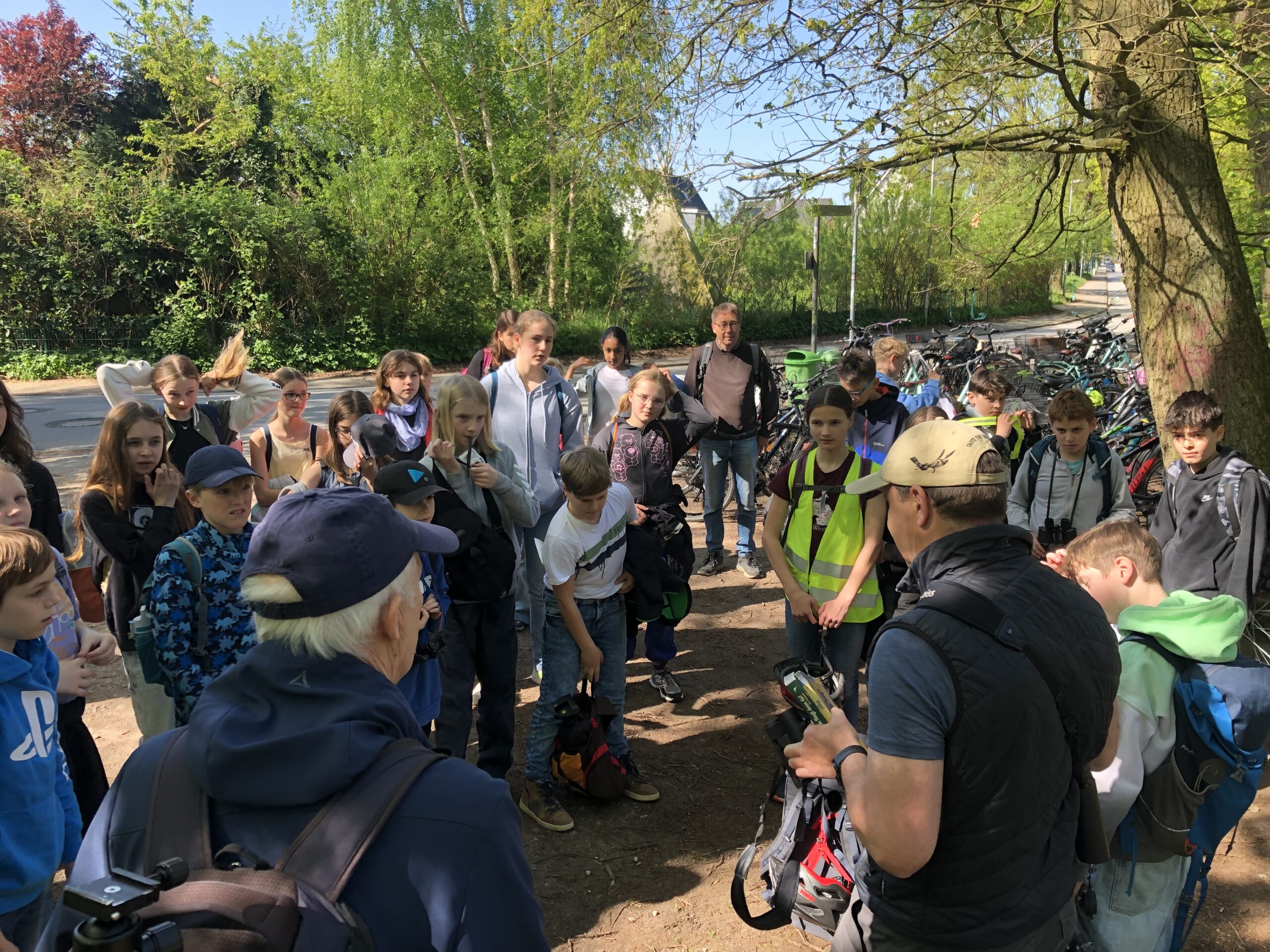 Alles fing damit an, dass wir mit dem Fahrrad zum Schellbruch gefahren sind. Dort begrüßten wir Herrn Daum und Herrn Anneken, statteten uns mit Ferngläsern aus und schon ging es in zwei Gruppen los.