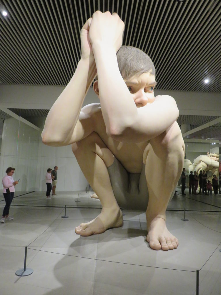 Der Wirkung eines Kunstwerks konnte sich niemand entziehen: Die fünf Meter hohe Glasfaserskulptur „Boy“ des australischen Künstlers Ron Mueck, 2001 vom ARoS erworben, bildet den zentralen Anziehungspunkt der BesucherInnen. Rundherum ist „Boy“ von Spiegeln umgegeben, so dass man alle Körperpartien zugleich wahrnehmen kann. Je nach Blickwinkel verändert sich der Gesichtsausdruck; die hyperrealistische Darstellung wirkt lebendig und befremdlich zugleich.