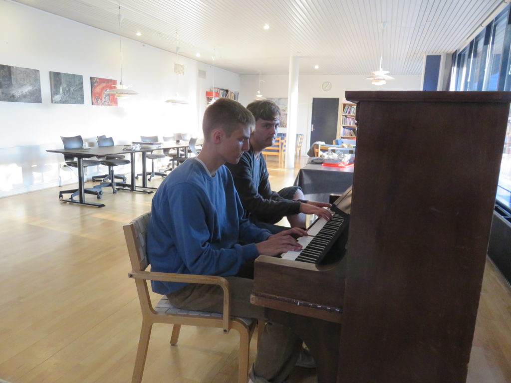 Der Tag endete Im Lehrerzimmer des Gymnasiums mit einem gemeinsamen Essen, an dem auch einige Gasteltern und die Geschwister der GastgeberInnen teilnahmen. Alle hatten etwas für das üppige Büfett mitgebracht. Anton und Joachim besiegelten die deutsch-dänische Freundschaft mit dem gemeinsamen Klavierspiel.