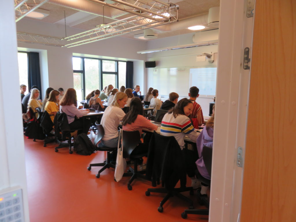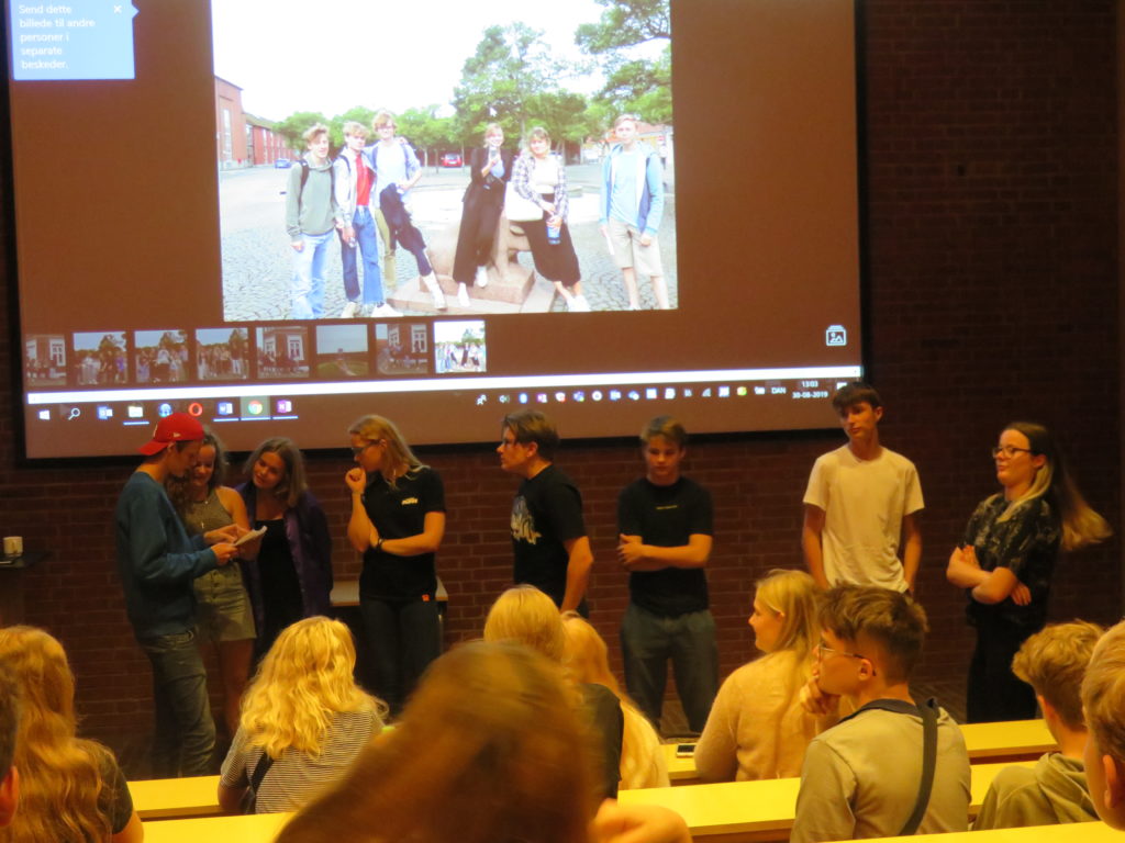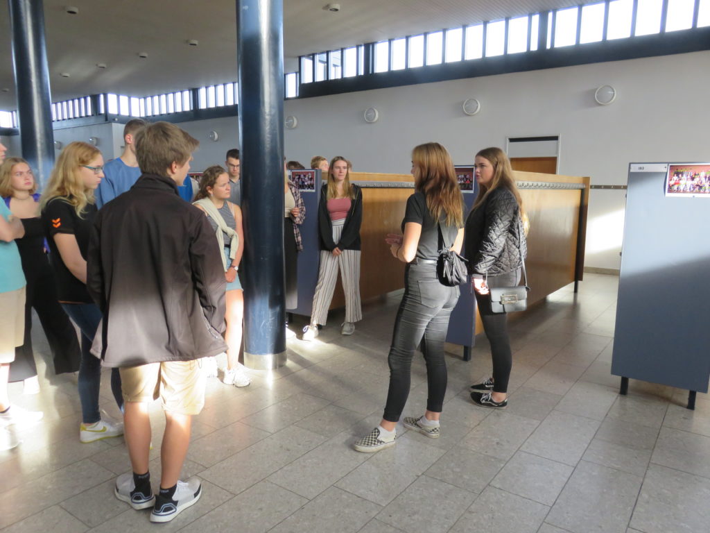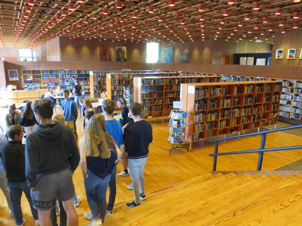 Am Freitagmorgen wurde die Q1a von den beiden Schülerinnen Regine und Sarah durch das Gymnasium geführt, in englischer Sprache, weil ihre Deutschkenntnisse noch nicht so umfangreich sind. In Dänemark besuchen die Schülerinnen und Schüler von 6 bis 16 Jahren gemeinsam die Folkeskole (Volksschule); anschließend kann man sich über das dreijährige Gymnasium bewerben, wo man dann mit der neuen Fremdsprache Deutsch beginnen kann.