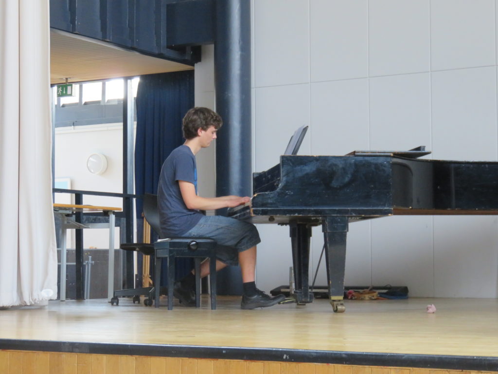 In der großen Aula stärkten wir uns nach der Busfahrt mit Kuchen und Getränken, während Joachim auf dem Flügel Jazzmelodien improvisierte.
