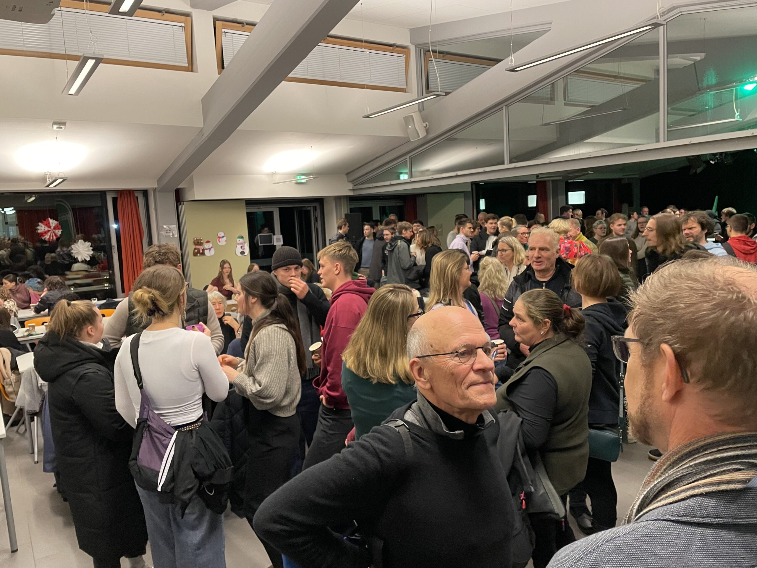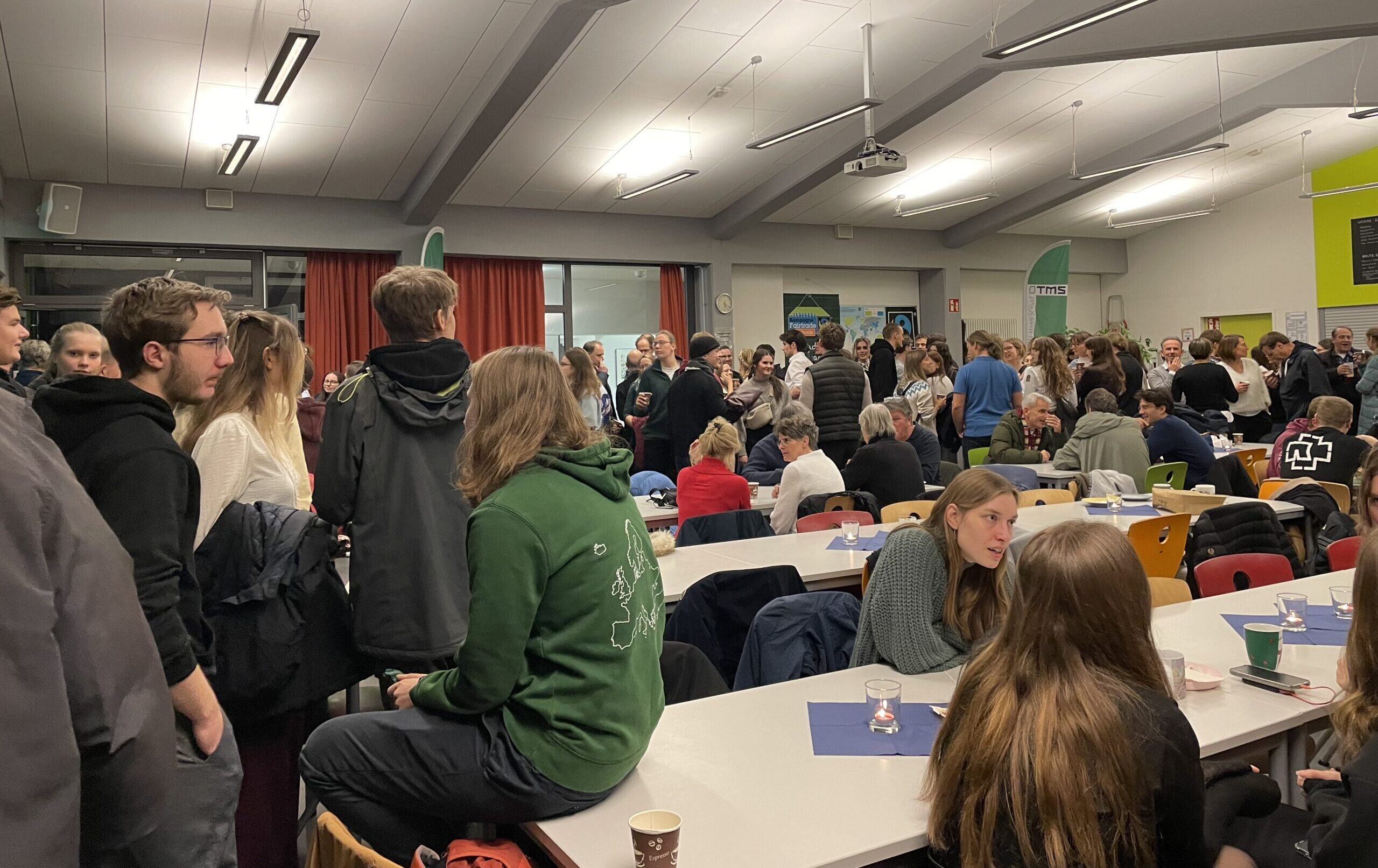 Insgesamt wurden 543 € gespendet, herzlichen Dank dafür! Unsere Idee, Spenden per QR-Code zu ermöglichen, war zwar gut gedacht, allerdings haben wir nicht damit gerechnet, dass die Mensa offenbar einen äußerst zuverlässigen natürlichen Schutz gegen WLAN-Empfang bietet. Sollte also noch jemand überlegen, ob die nächste Silvester-Rakete wirklich nötig ist oder ob stattdessen der Schulverein unterstützt werden soll, freuen wir uns sehr über jede weitere Spende auf unser Konto. Die Kosten der Veranstaltung sind bislang etwa zur Hälfte gedeckt.