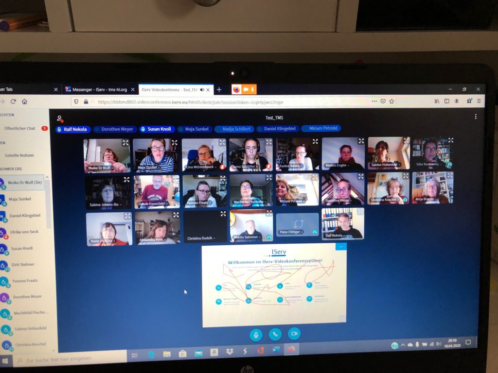Und mittlerweile ist auf IServ ein Modul für Videokonferenzen installiert. Damit wollen wir den Kontakt zwischen Lehrkräften und Jugendlichen intensivieren. Das einheitliche System macht das Runterladen anderer Apps überflüssig. Und weil auch Lehrer sich mit dem Videochat vertraut machen müssen, wird fleißig geübt. In vier aufeinander folgenden Abenden „treffen“ sich Lehrkräfte online zur Videokonferenz und erproben unterschiedliche Funktionen.