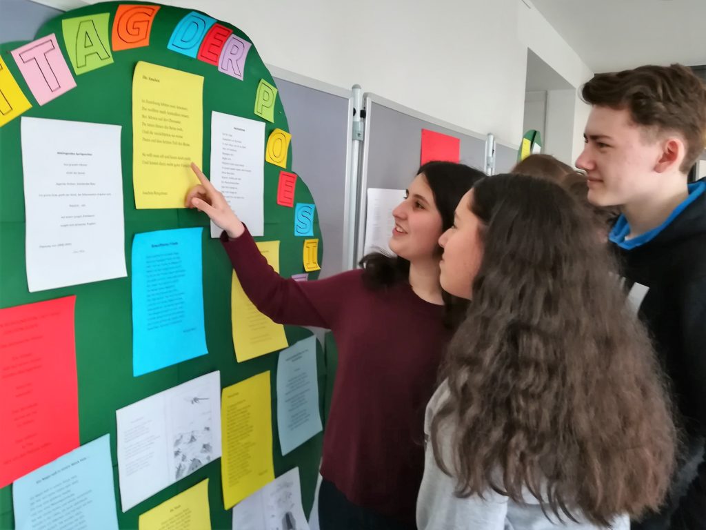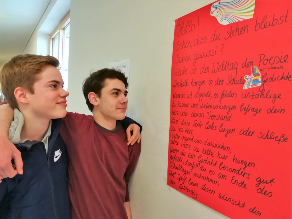 Mit diesen Worten wurden Schüler und Lehrer am 22.3., dem Welttag der Poesie, zu einem Lesebummel durch das Gebäude aufgefordert. Auch die 9b ließ sich einladen, schlenderte lesend durch die Flure und ließ sich berühren von Rainer Maria Rilkes „Schlussstück“, von Joseph von Eichendorffs „Mondnacht“, Eduard Mörikes „Um Mitternacht“ und vielen weiteren ernsten, träumerischen, heiteren und herausfordernden Gedichten. Zu entdecken gab es ungefähr hundert lyrische Texte. Und die Schülerinnen und Schüler ließen sich auf sie ein. Manche standen in Gruppen zusammen, machten sich gegenseitig auf für sie Bedeutsames aufmerksam, andere vertieften sich allein in die Gedichte.