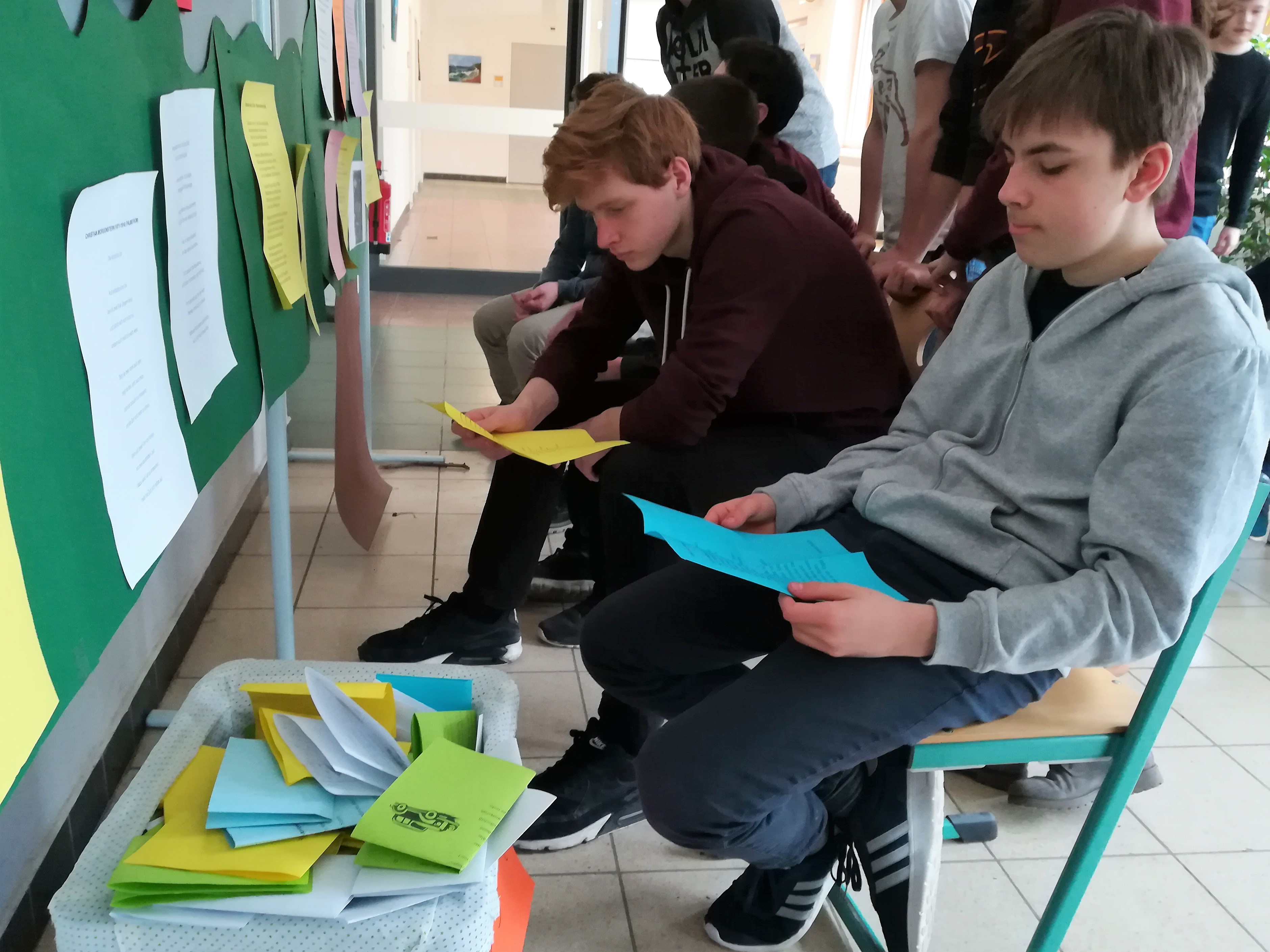 Wir danken Frau Koschel und ihren Helferinnen und Helfern für diese wunderbare Aktion, die uns ermöglicht hat, poetische Texte selbst zu entdecken, zu genießen, sich von ihnen berühren zu lassen und über ihre Bedeutung für das eigene Leben ins Gespräch zu kommen.