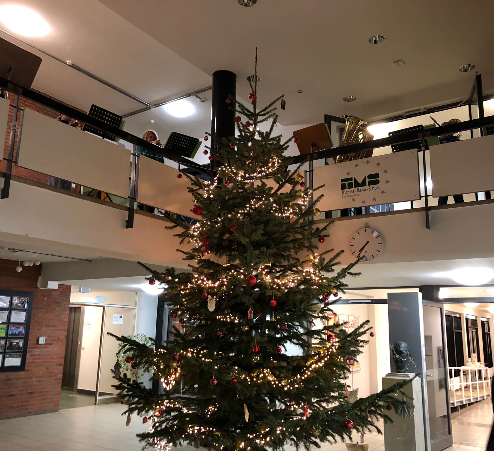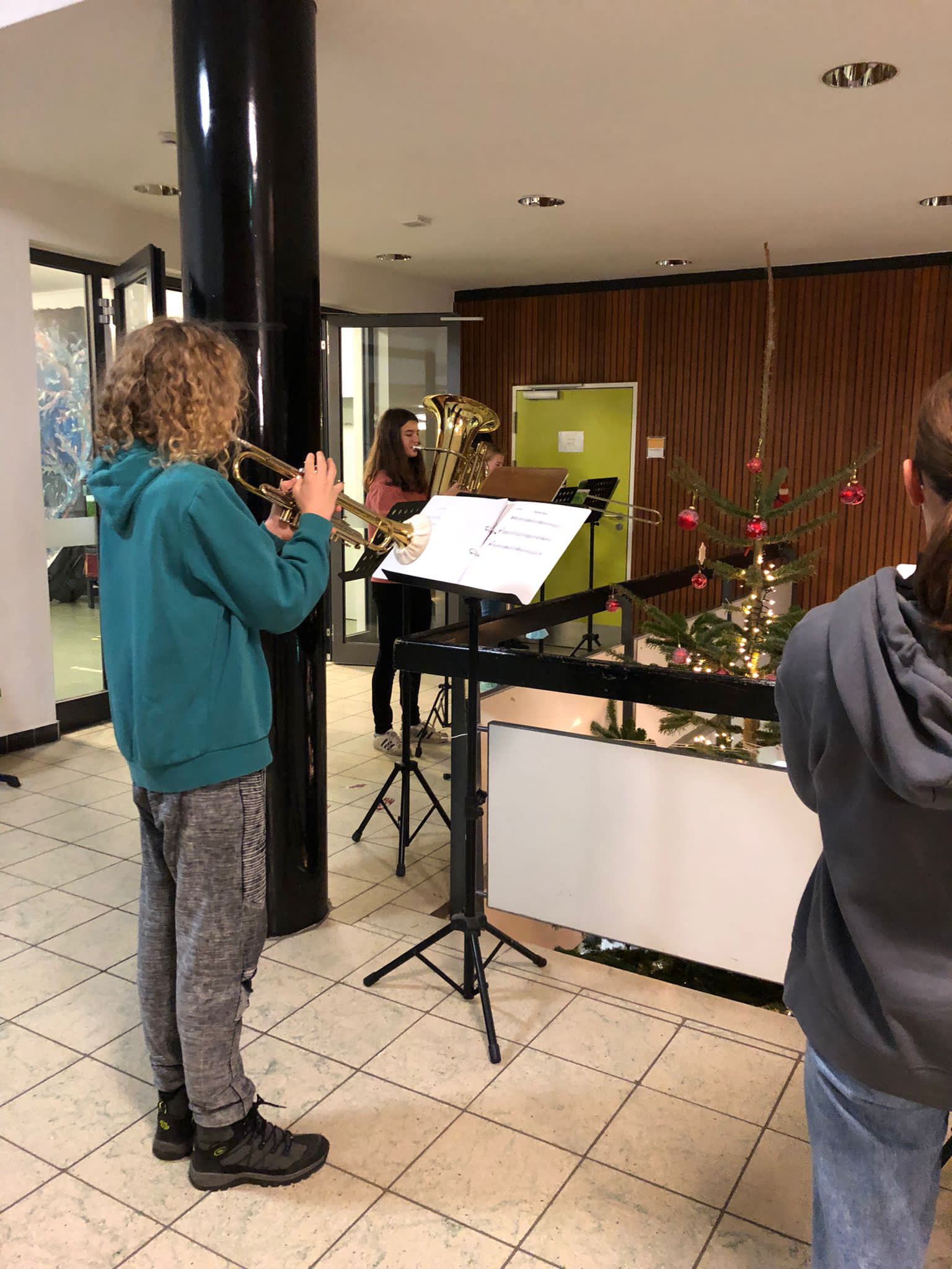 Mit festlicher Musik begrüßte das Bläserensemble am letzten Schultag vor den Weihnachtsferien alle, die aus der Dunkelheit kommend das Schulgebäude betraten.