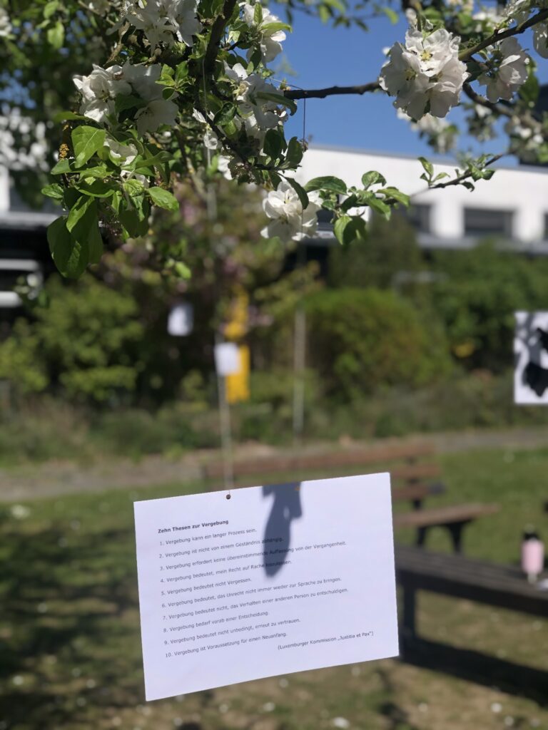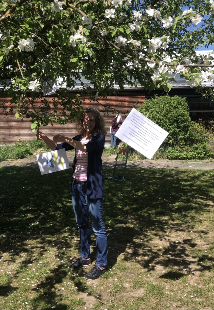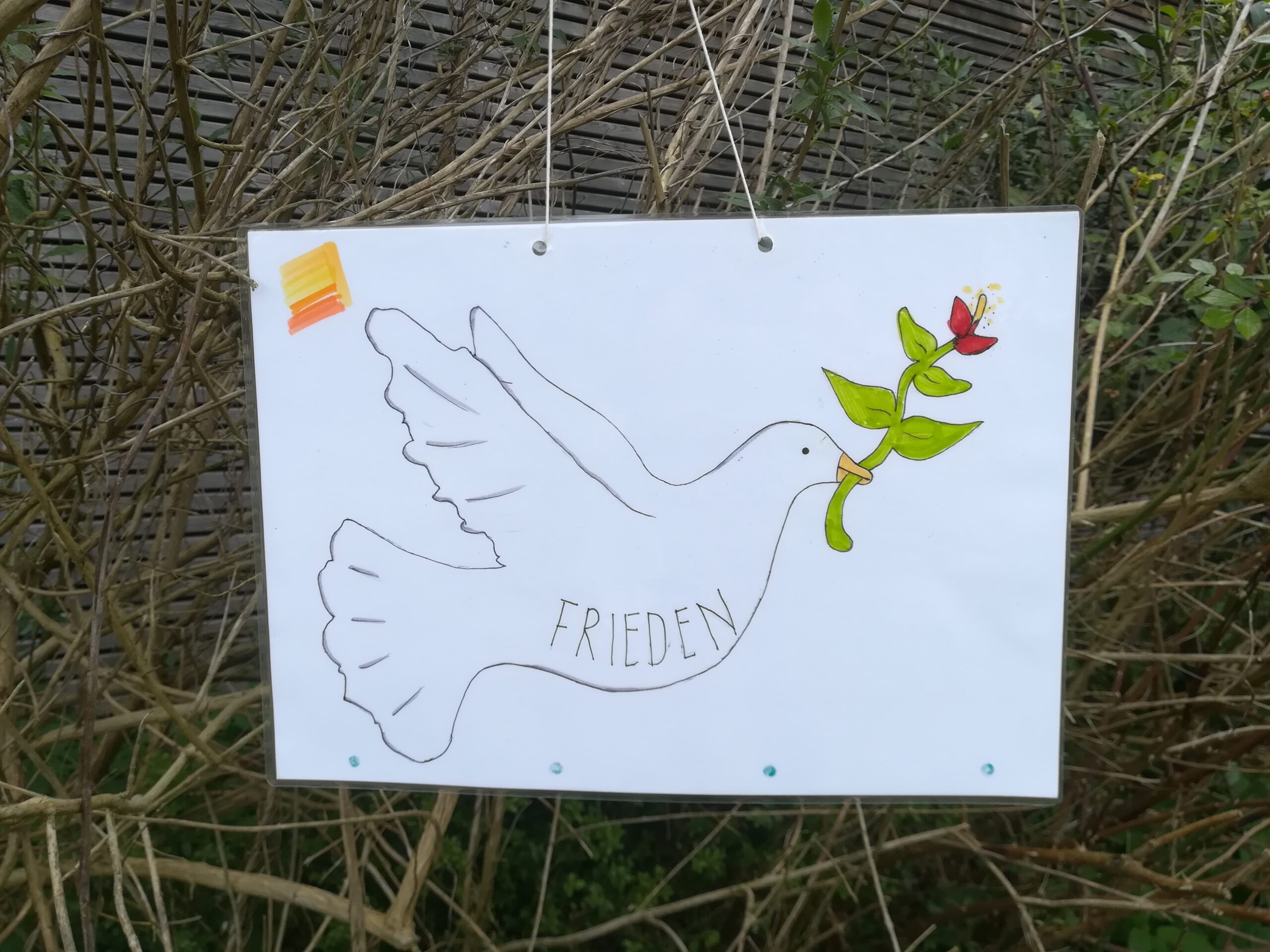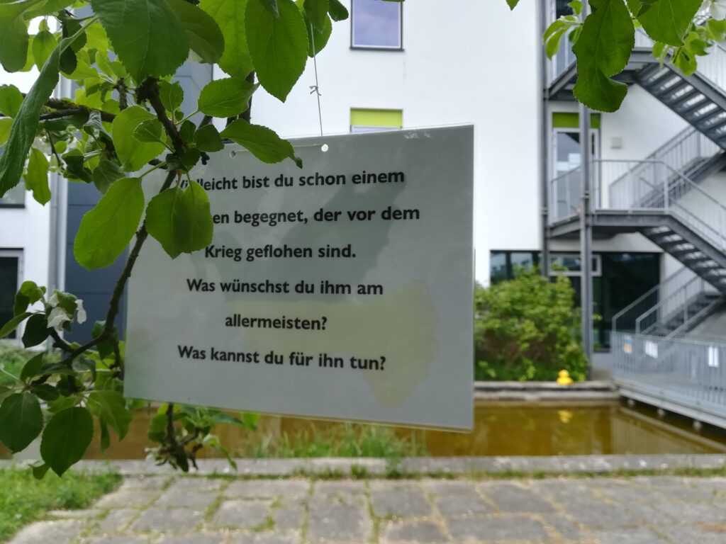 Als wir über 60 laminierte Friedenstauben und Friedenstexte gemeinsam im Innenhof an blühende Zweige, an das Brückengeländer und zwischen die Insektenhotels hängen, sind wir umgeben von warmem Sonnenschein und herrlichem Blütenduft. Bienen summen geschäftig, ansonsten herrscht unglaubliche Ruhe. Hier ist er – der Frieden.