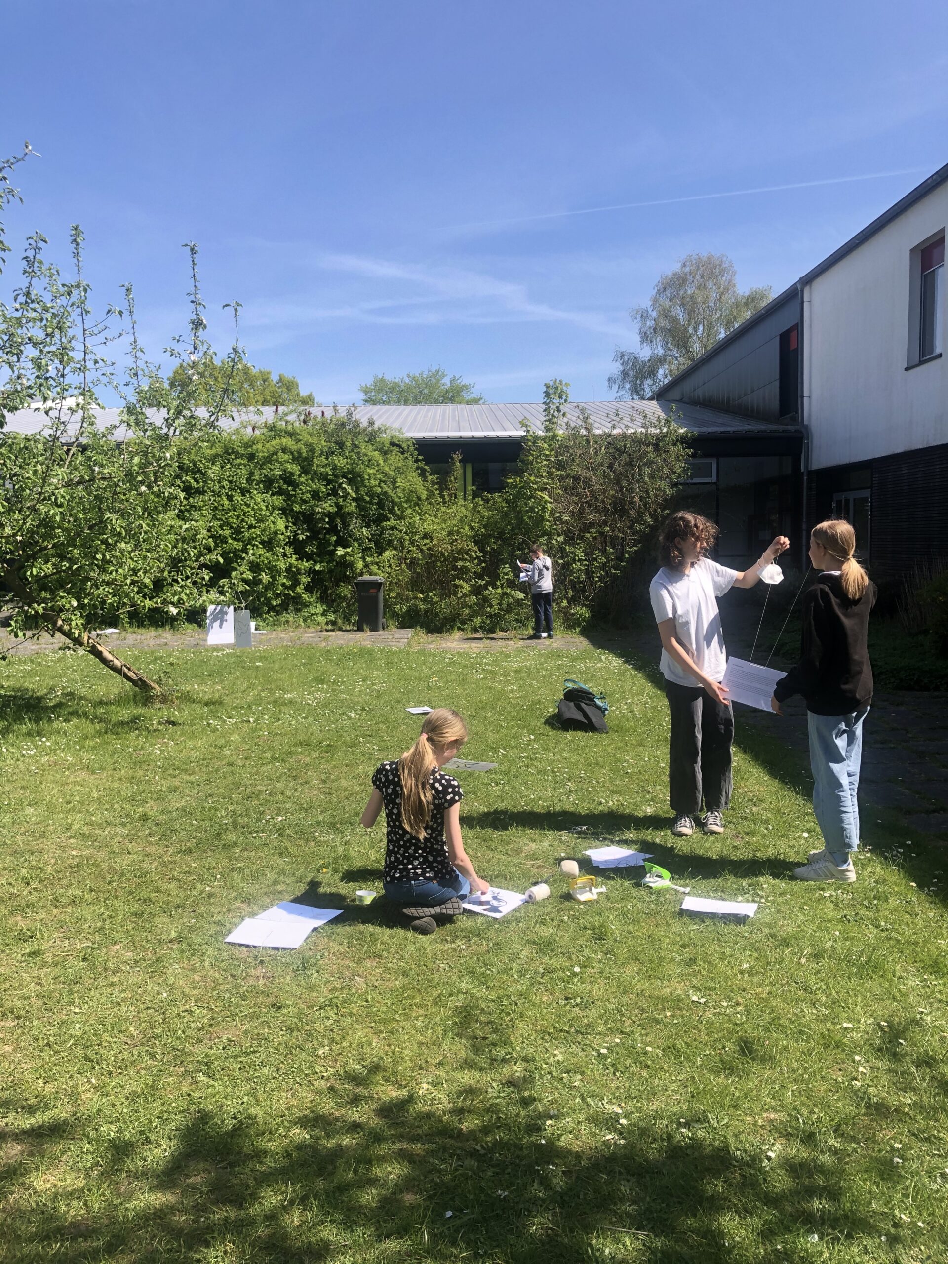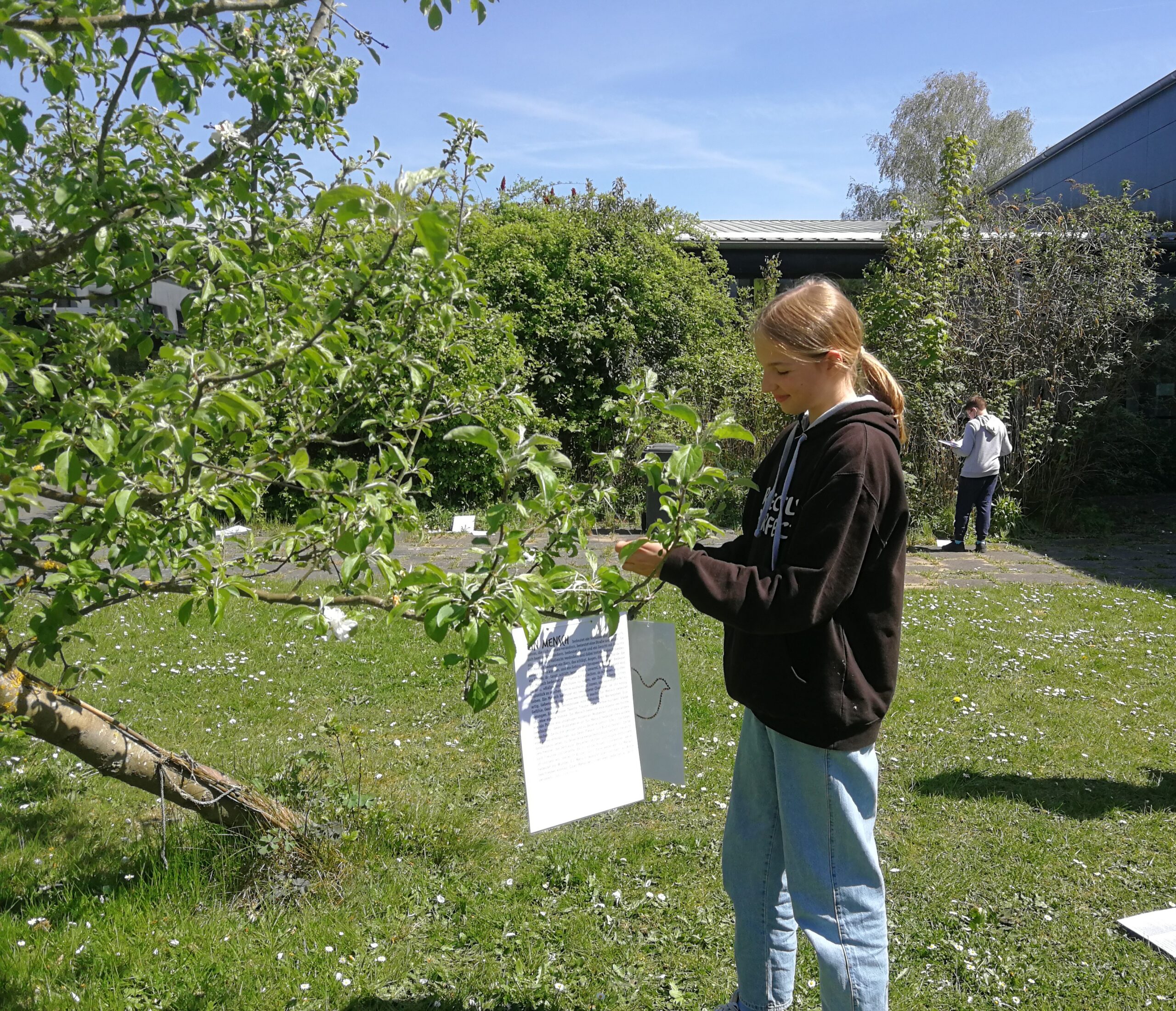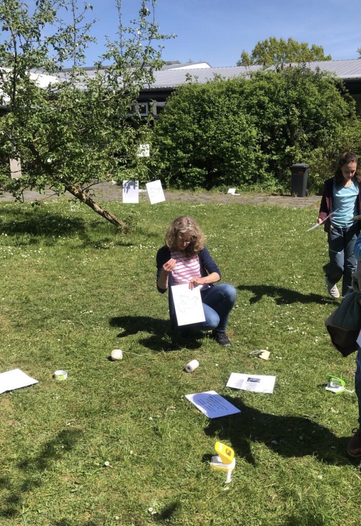 Als wir über 60 laminierte Friedenstauben und Friedenstexte gemeinsam im Innenhof an blühende Zweige, an das Brückengeländer und zwischen die Insektenhotels hängen, sind wir umgeben von warmem Sonnenschein und herrlichem Blütenduft. Bienen summen geschäftig, ansonsten herrscht unglaubliche Ruhe. Hier ist er – der Frieden.