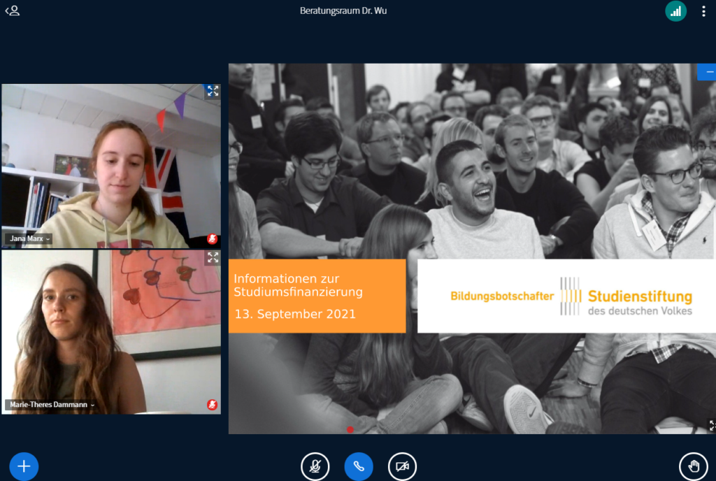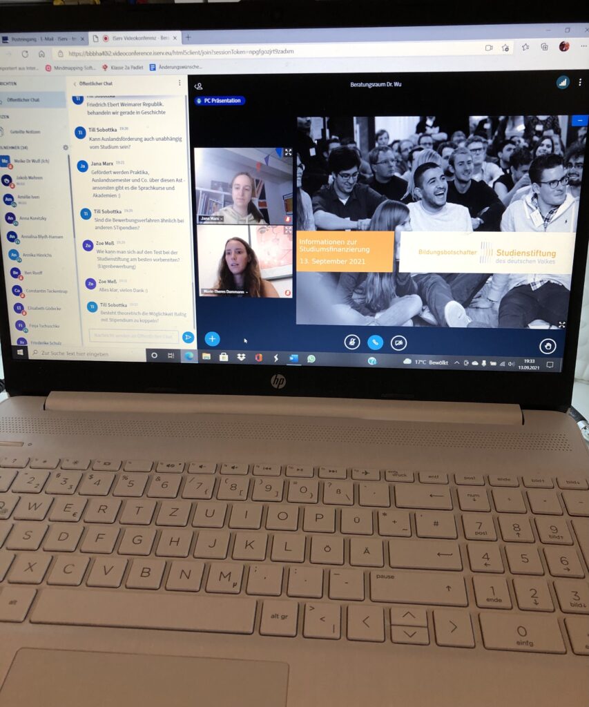 Im Rahmen des neuen Curriculums zur Studien- und Berufsorientierung der TMS boten Marie-Theres Dammann und Jana Marx (21), „Botschafterinnen der Studienstiftung des deutschen Volkes“, selbst noch Studierende, zum zweiten Mal nach 2019 eine am Montag, 13.09.21 eine Veranstaltung an, in der sie die Wege zur Finanzierung des Studiums vorstellten.