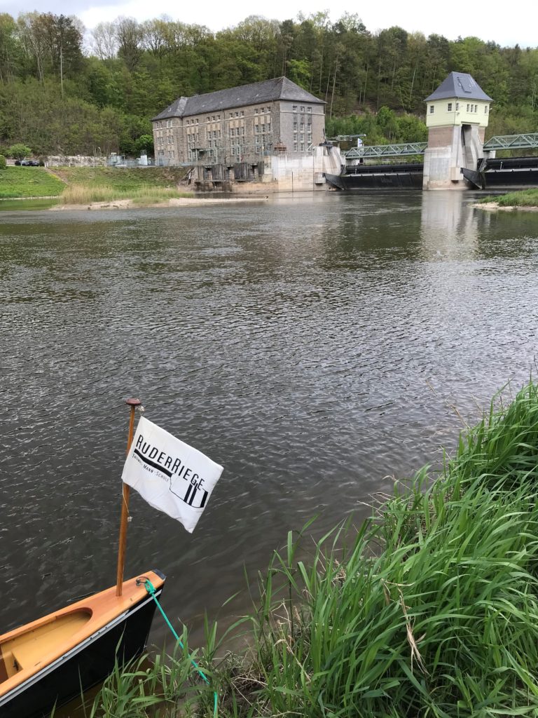 In diesem Jahr klappte die Anreise nach Witzenhausen sehr gut. Obwohl wir eine Stunde später gestartet waren als die Dräger-Betriebssportgruppe mit dem Anhänger, auf dem unsere Boote lagen, waren wir fast gleichzeitig beim dortigen Kanuverein und konnten gemeinsam abladen und aufriggern. Wie erwartet war der Wasserstand deutlich niedriger als normal, denn es hatte ja im April kaum geregnet. Nach dem Durchqueren des Flutgrabens mit Wildwasser, eine der Stellen, die der Rudermannschaft einiges abverlangten, erreichten wir die Übersatzstelle am letzten Heller und konnten dank unseres Landdienstes zügig übersetzen. Bei 4° C hatte niemand Lust, Schuhe und Strümpfe auszuziehen und ins Wasser zu steigen, und deshalb waren wir dem Landdienst sehr dankbar für die Hilfe.