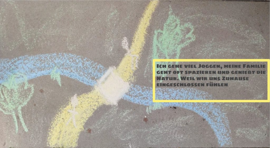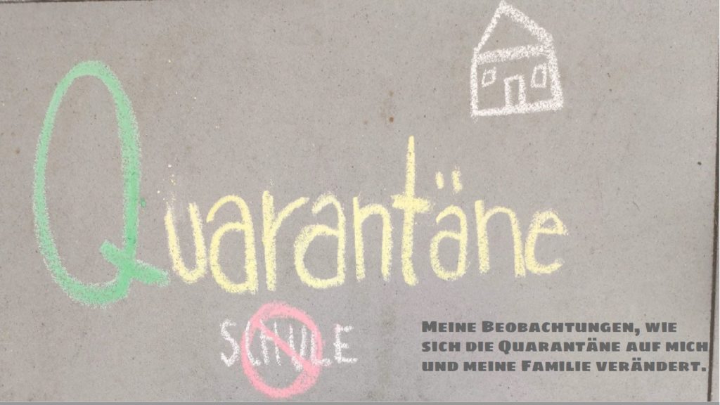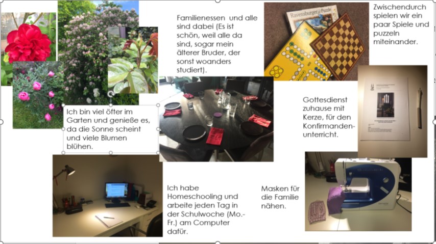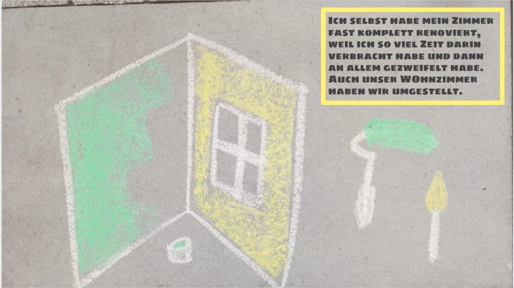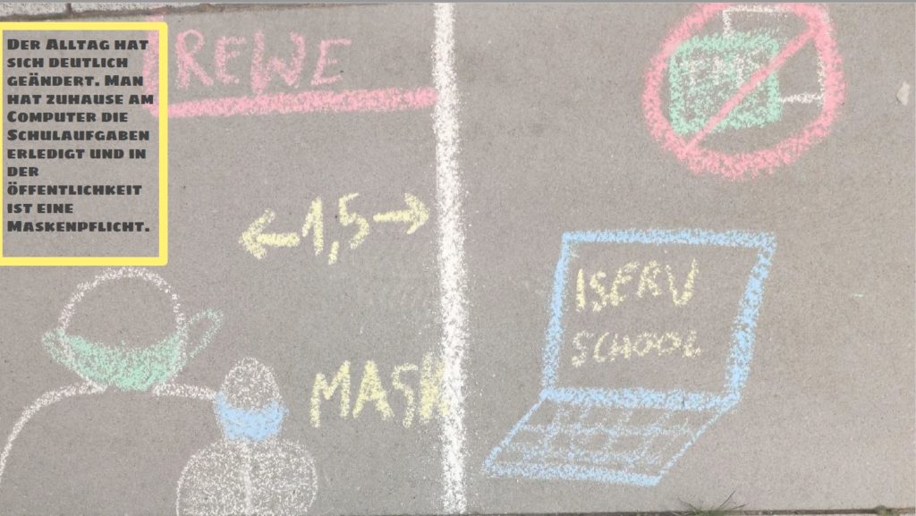 Der Wahlpflichtkurs Kurs Darstellendes Spiel der Klassenstufe 8 hat sich im Fernunterricht mit der Frage auseinandergesetzt, wie sich die Schulschließungen, Kontaktbeschränkungen und andere Infektionsschutzbestimmungen auf sie selbst, ihre Familie oder ihre nähere Umgebung auswirken. Sie haben ihre nähere Umgebung betrachtet und ein Beispiel dazu ausgewählt, welche Veränderungen im Alltag für sie besonders bedeutsam sind.