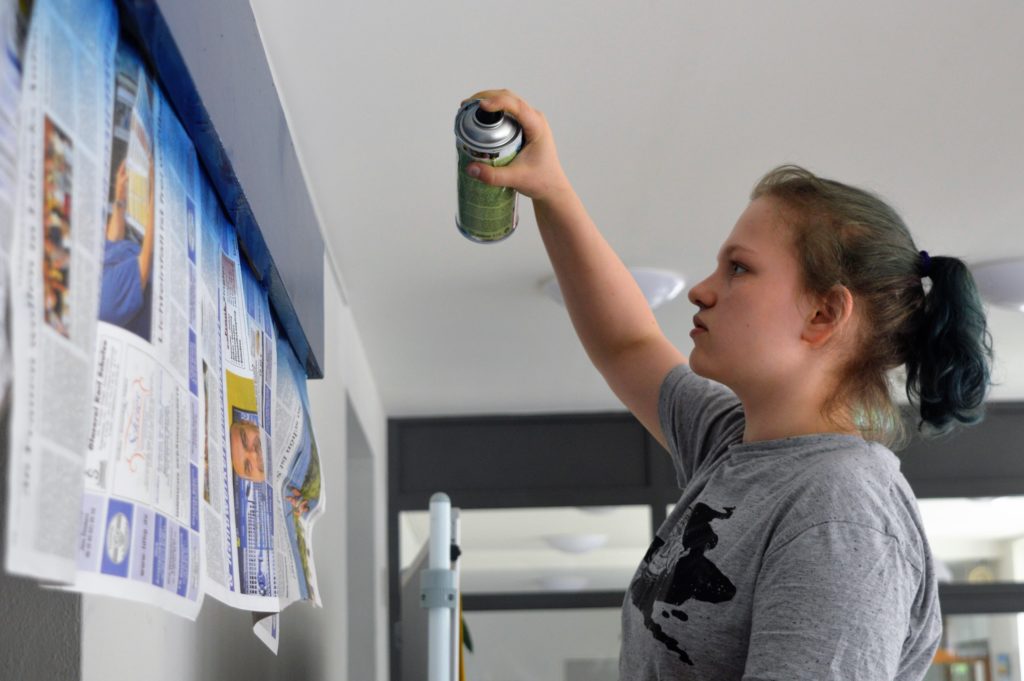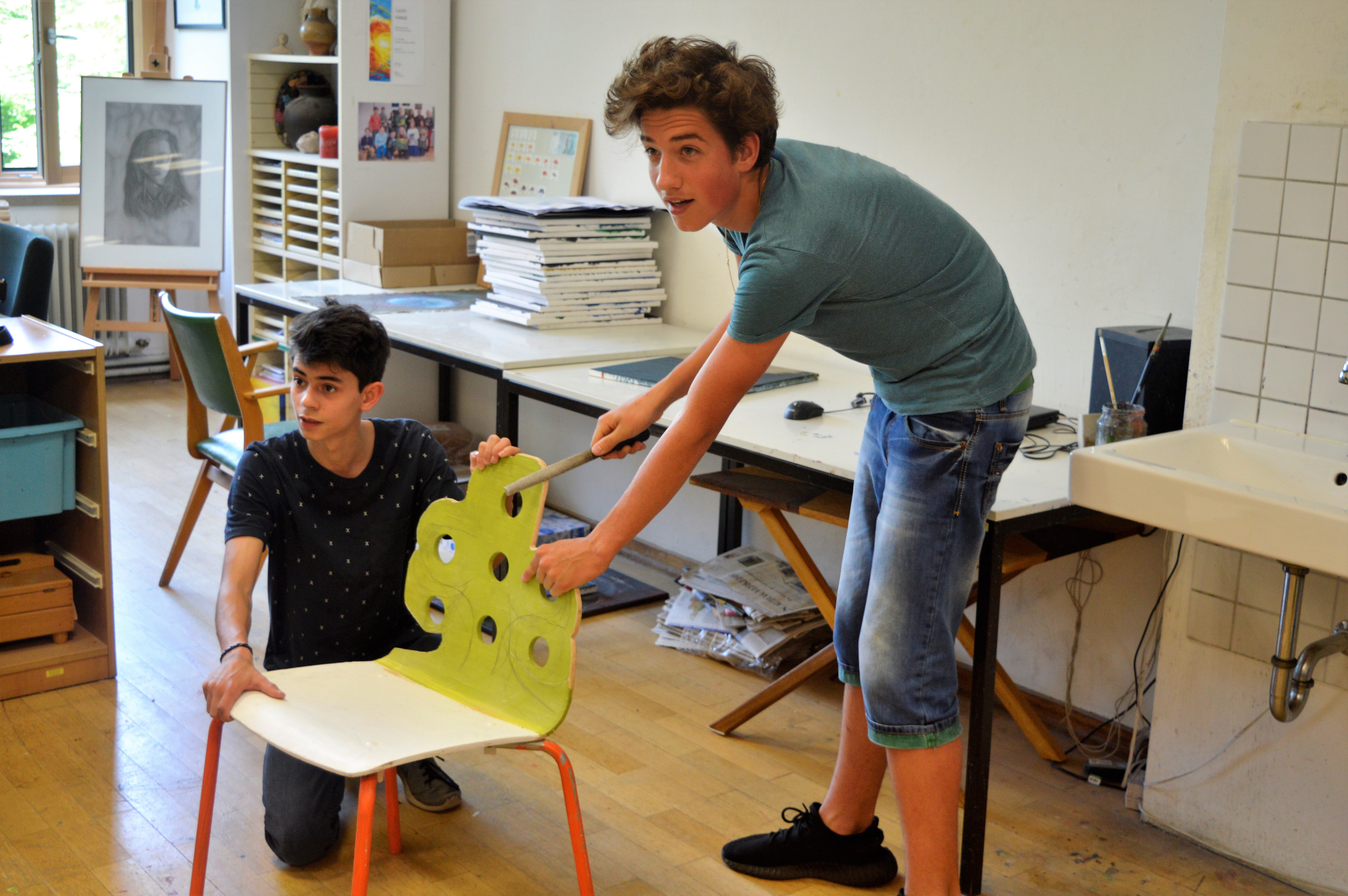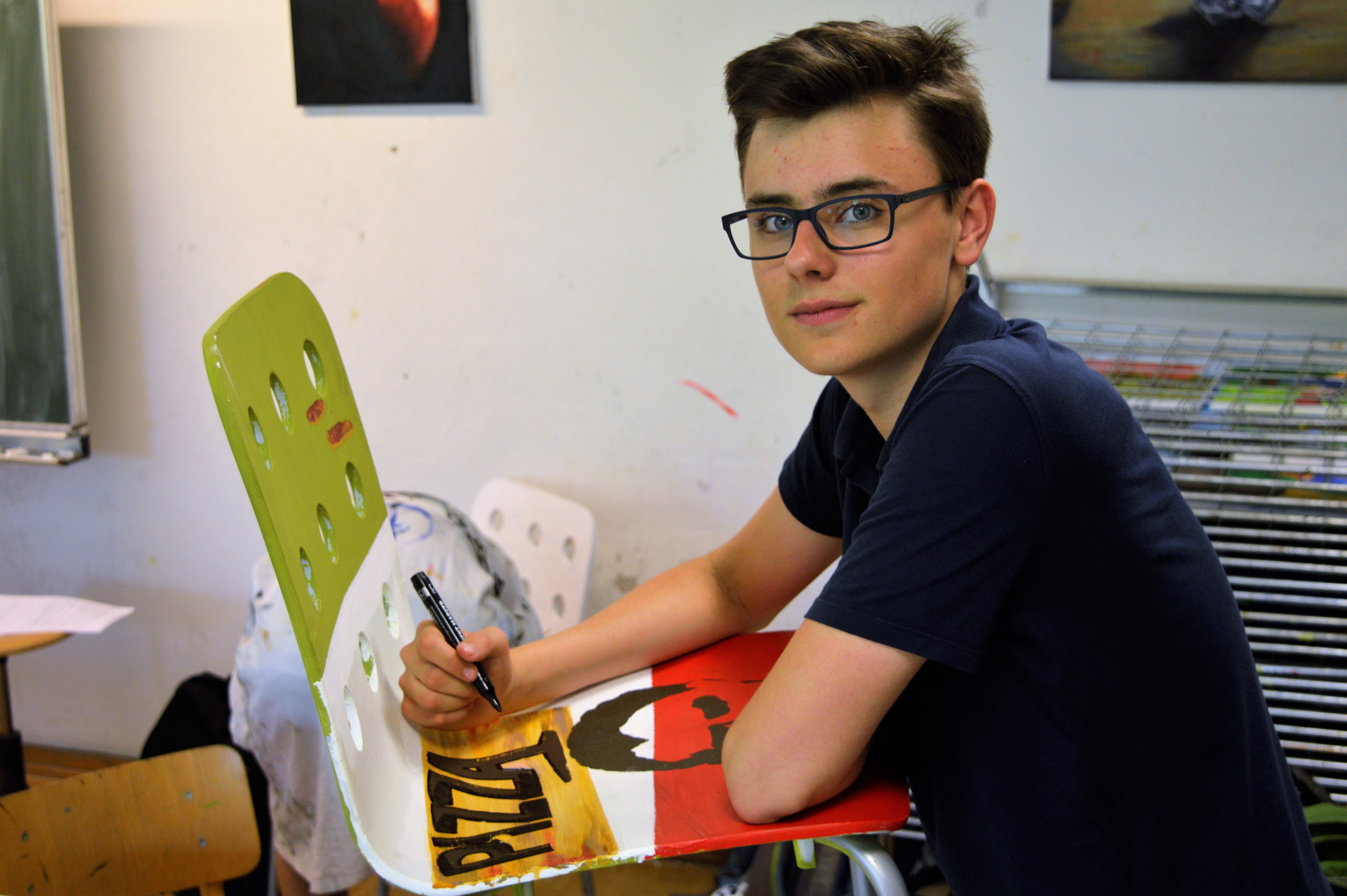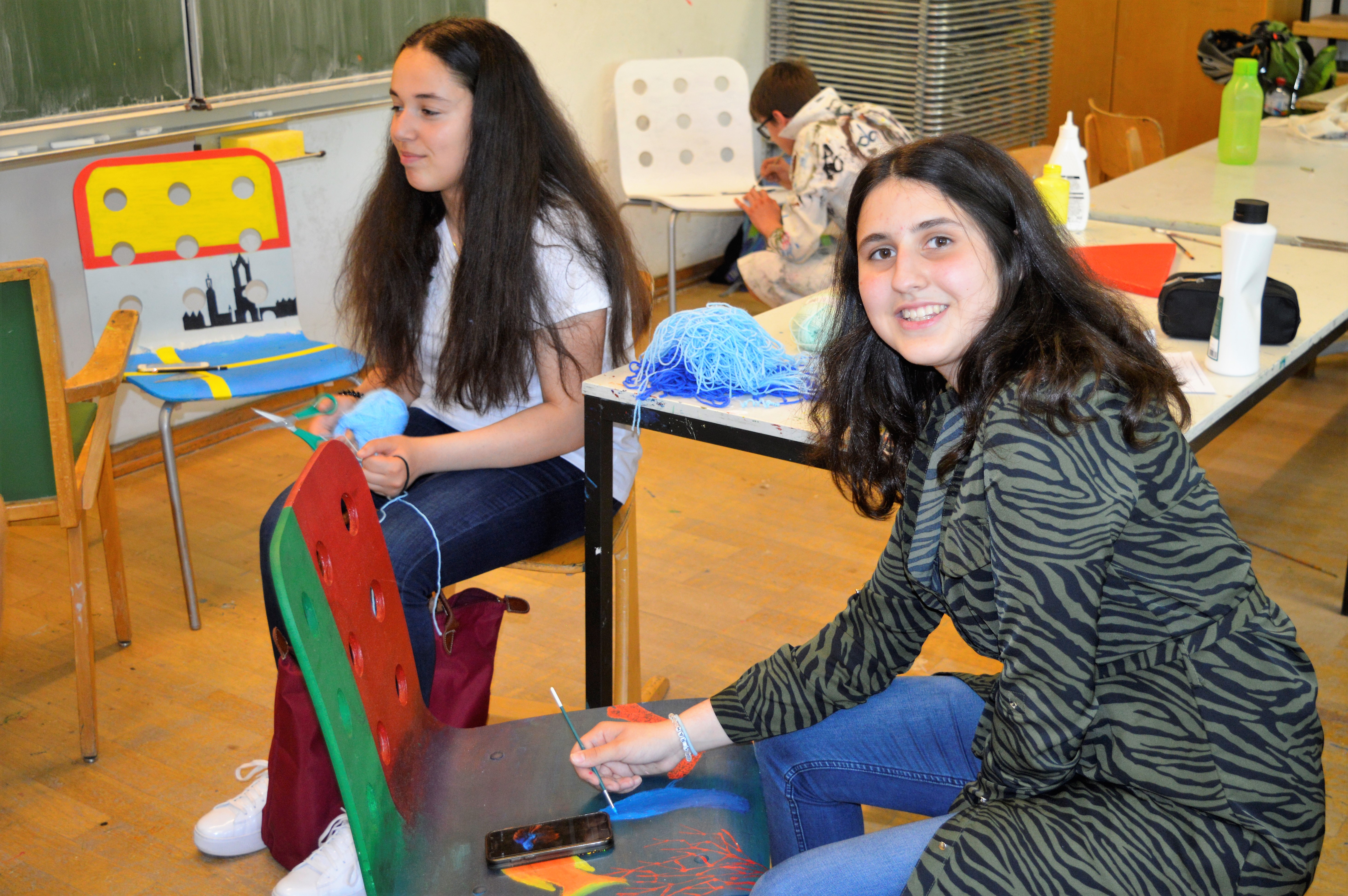 Die Klasse 9b hatte noch einen besonderen Beitrag zur Europaecke erbracht: Unter der Leitung von Kunstlehrer Ingo Bruweleit und Geografielehrer Mirko Dahmke hatten die Schülerinnen und Schüler in Teams Stühle zu Mitgliedsstaaten der EU gestaltet.