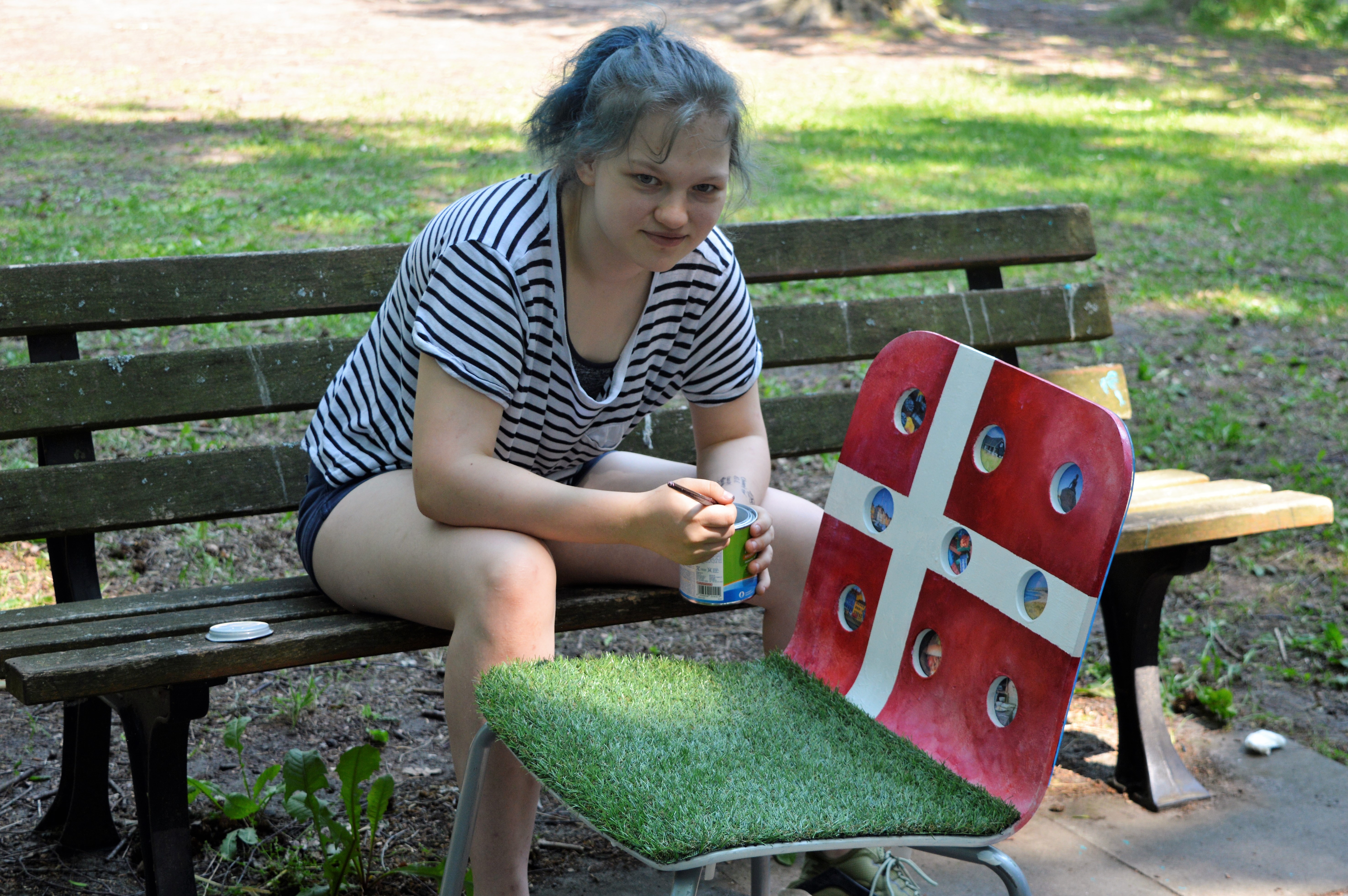 Die Sitzfläche aus Kunstrasen, in den Löchern der Lehne Bilder dänischer Sehenswürdigkeiten und Spezialitäten – Laras Stuhl beeindruckt.