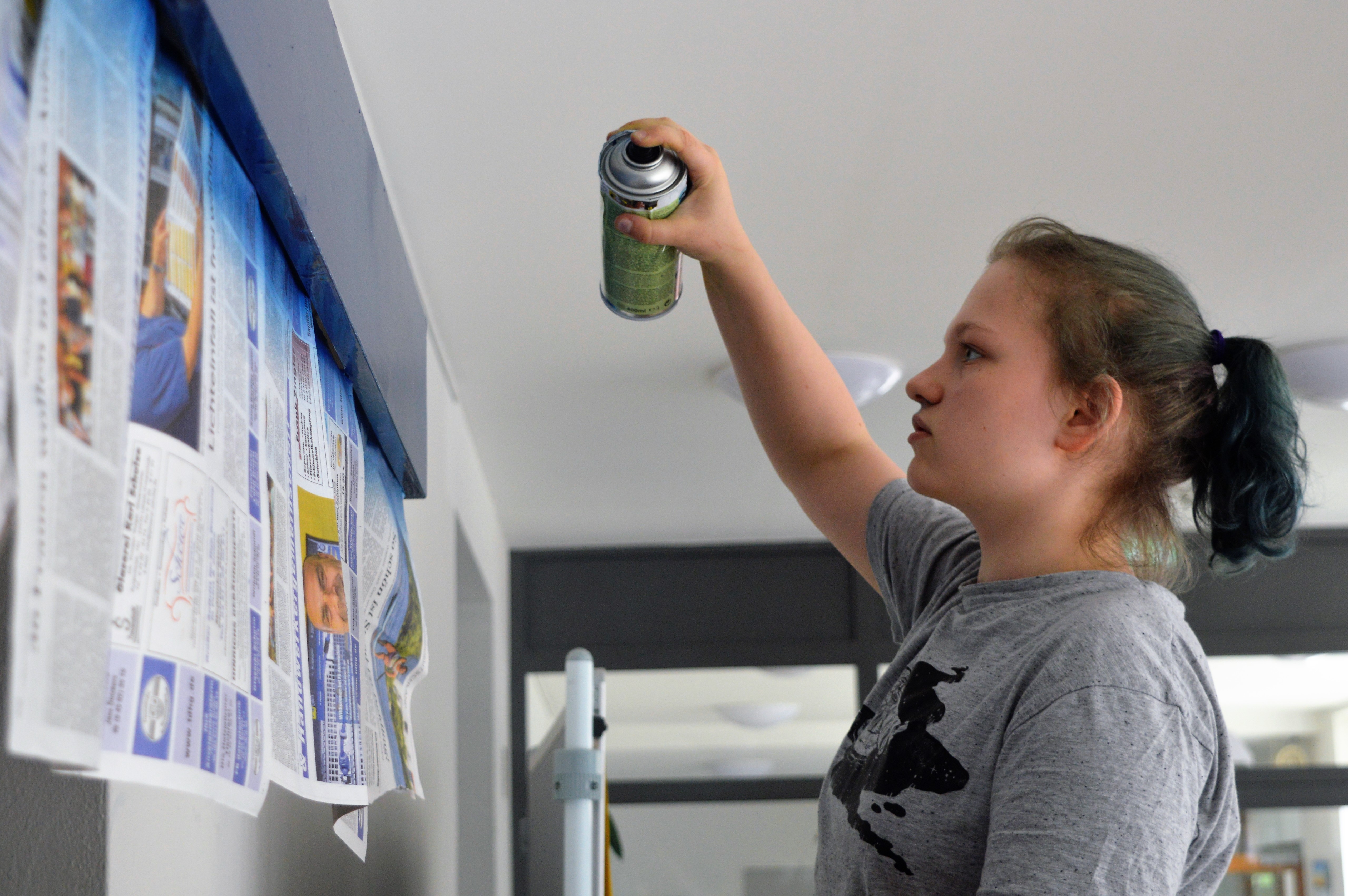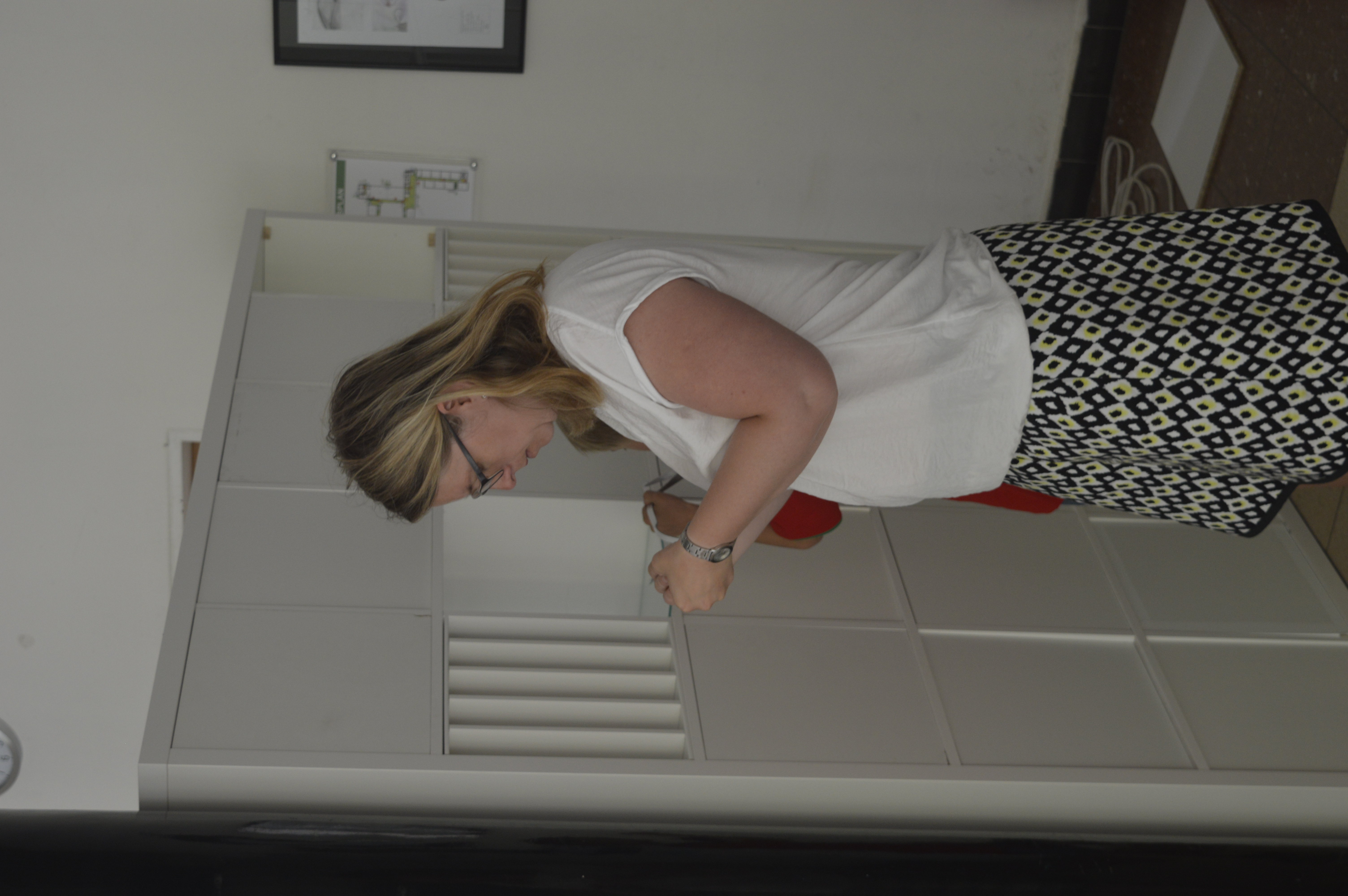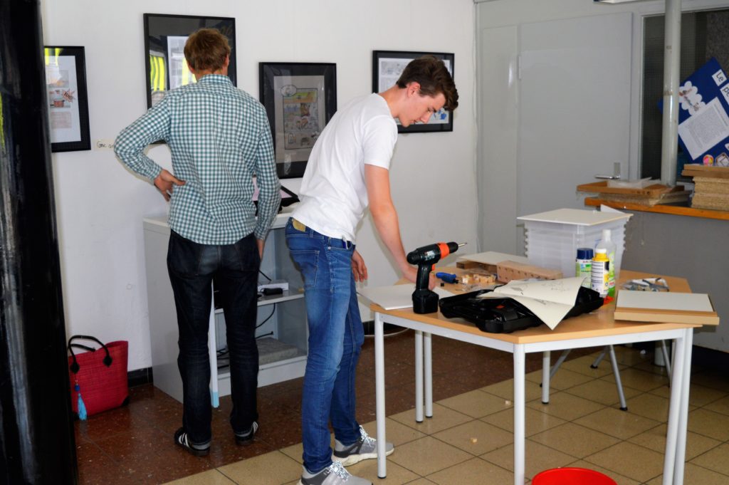Frau Fraatz befestigt die Regalwände für die Infotafeln über die Mitgliedsstaaten der Europäischen Union.