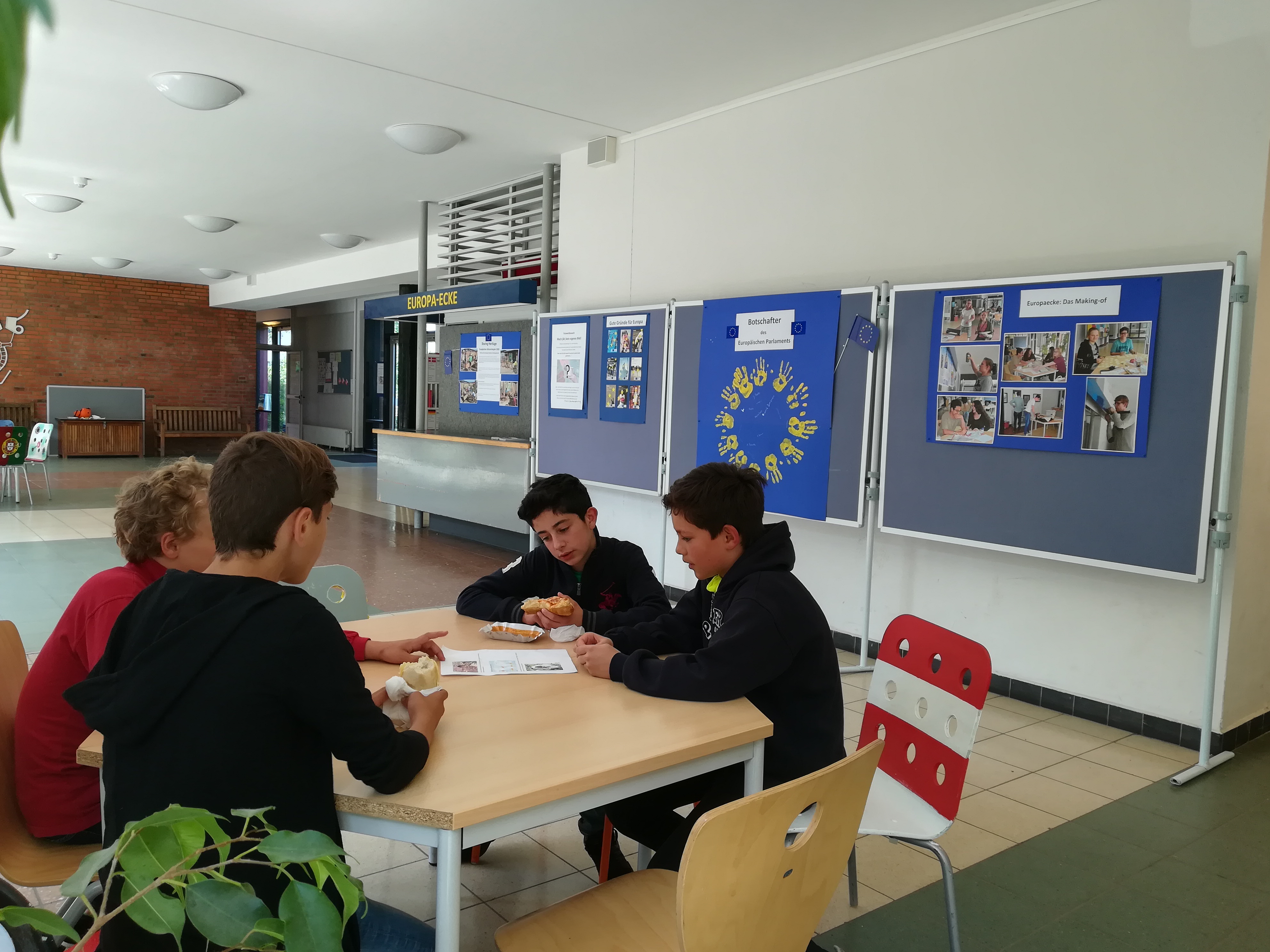 Vorher hatten die 19 Juniorbotschafter, so werden die Schülerinnen und Schüler genannt, die sich dafür engagieren, das Bewusstsein für Europa und die Bedeutung des Parlaments zu stärken, einiges an Arbeit in die Gestaltung der Europaecke gesteckt.