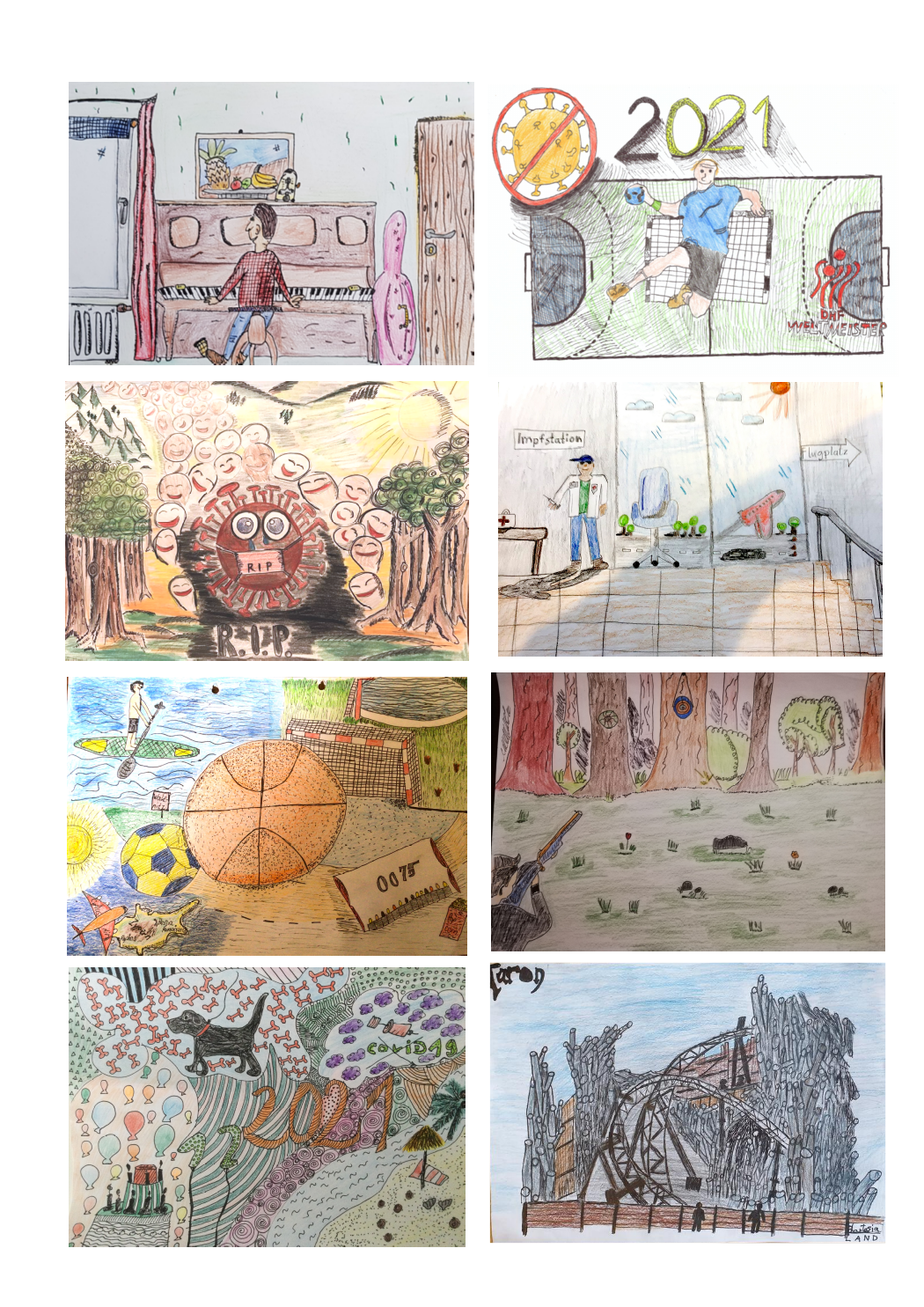 In den Zeichnungen finden sich viele verschiedene Wünsche und Vorhaben: z.B. ein Instrument spielen lernen, mehr Sport treiben, gesünder essen, kochen lernen, Reisen und Ausflüge mit der Familie, Freunde treffen usw. Aber natürlich wünschen sich alle vor allem das Ende der Corona-Pandemie!