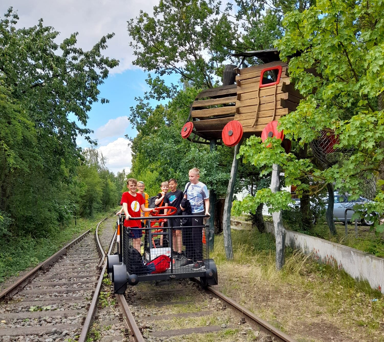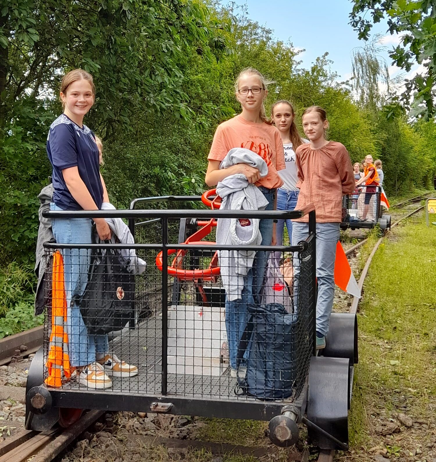 Nach kurzer Wartezeit teilte sich unsere Klasse in viele 6-er Gruppen auf und wir starteten nacheinander mit unterschiedlichen Draisinen.