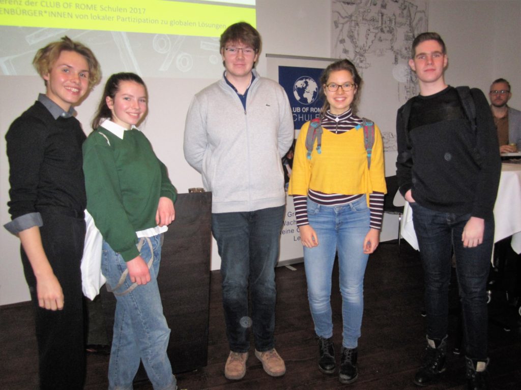 Am 28. November 2017 nahm eine Gruppe von sieben Schülern aus dem E- und Q1-Jahrgang unter der Leitung von Frau Pichura an der Jahreskonferenz des Schulnetzwerkes des Club of Rome teil. Dabei wurden vier verschiedene Vorträge über Themen wie Klimawandel und Nachhaltigkeit, gute SV-Arbeit und auch politisches Bewusstsein gehalten.