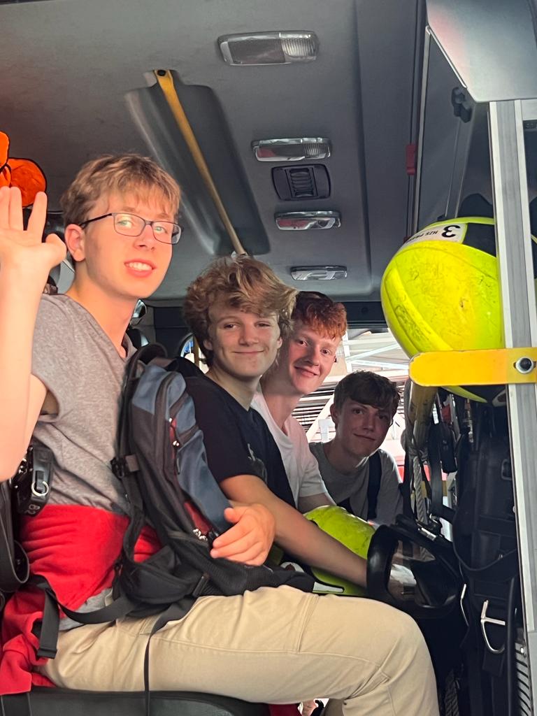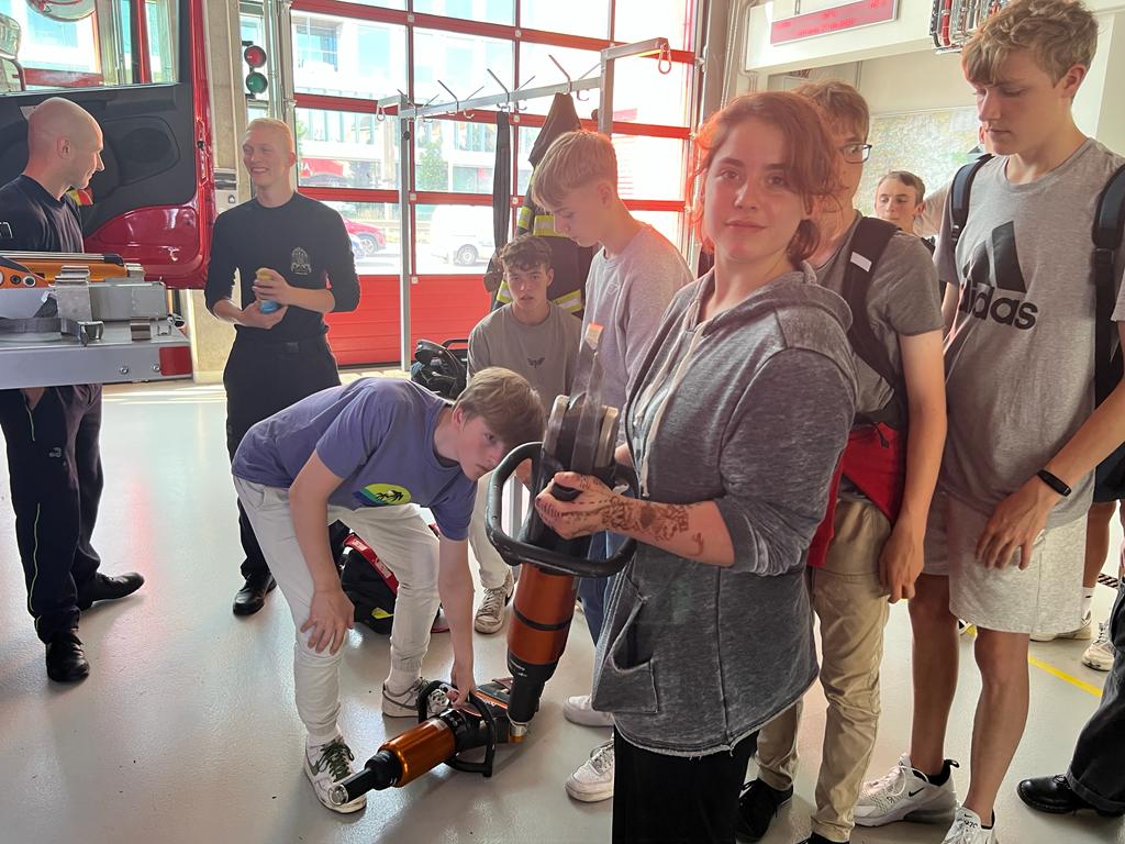 Zuerst sahen wir das Büro der Wache. Von hier kann man alles überwachen und auch die Einsatzmeldungen werden hier angezeigt. Danach gingen wir in die Halle, wo viele verschiedene Feuerwehrfahrzeuge einsatzbereit standen. Uns wurden viele verschiedene Geräte gezeigt, mit denen man zum Beispiel Scheiben einschlagen, Beton schneiden oder Menschen transportieren kann. Zwei schwere Geräte durften wir hochheben und viele von uns waren von dem Gewicht überrascht. Einer der Feuerwehrleute demonstrierte die vielen Funktionen der Kleidung und Anzüge die für Feuer, Wasser und vieles mehr verwendet werden. Dann durften wir in kleinen Gruppen in ein Feuerwehrauto klettern, wo Helme, Masken und Werkzeuge bereitlagen. ( Nathalie)