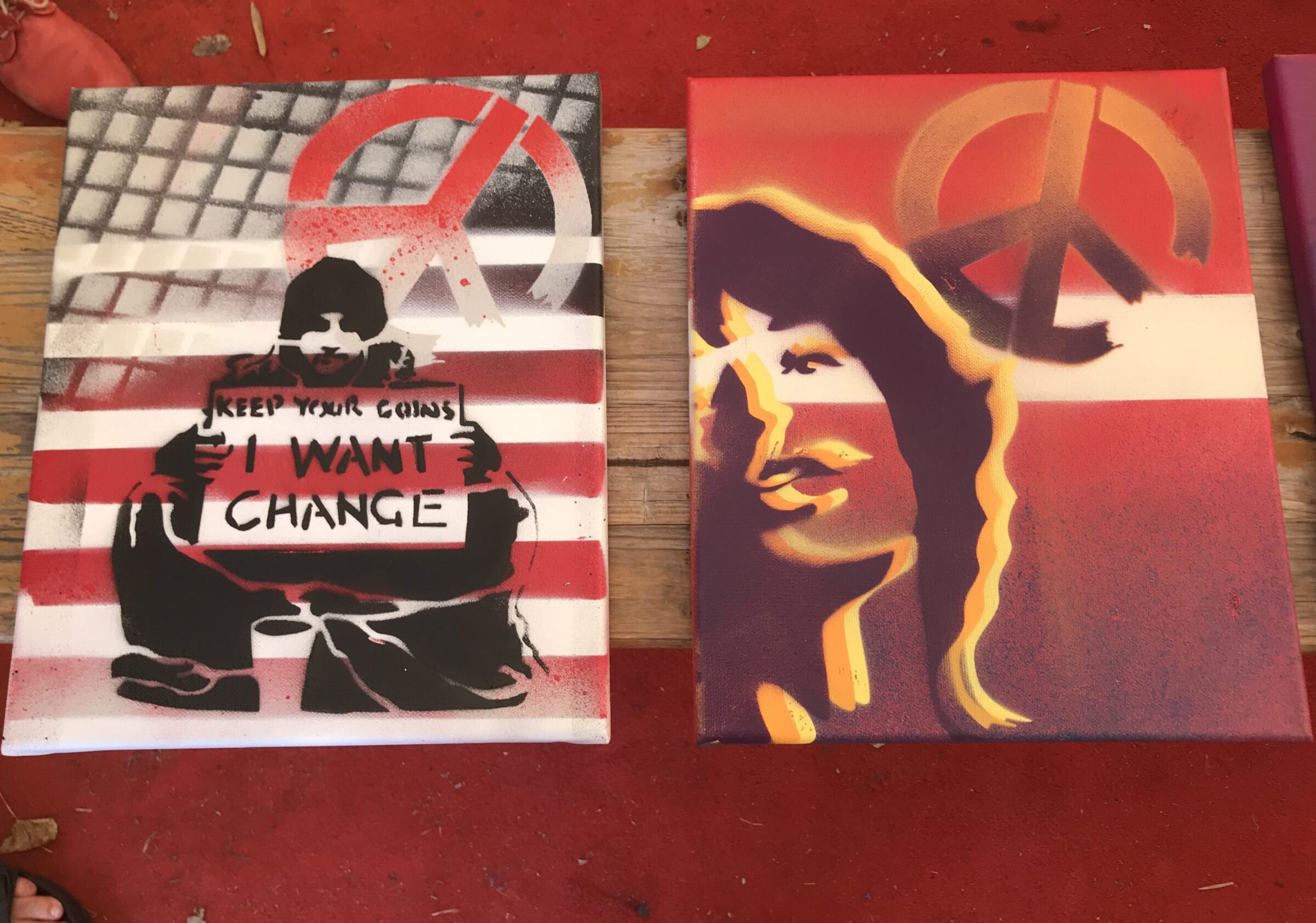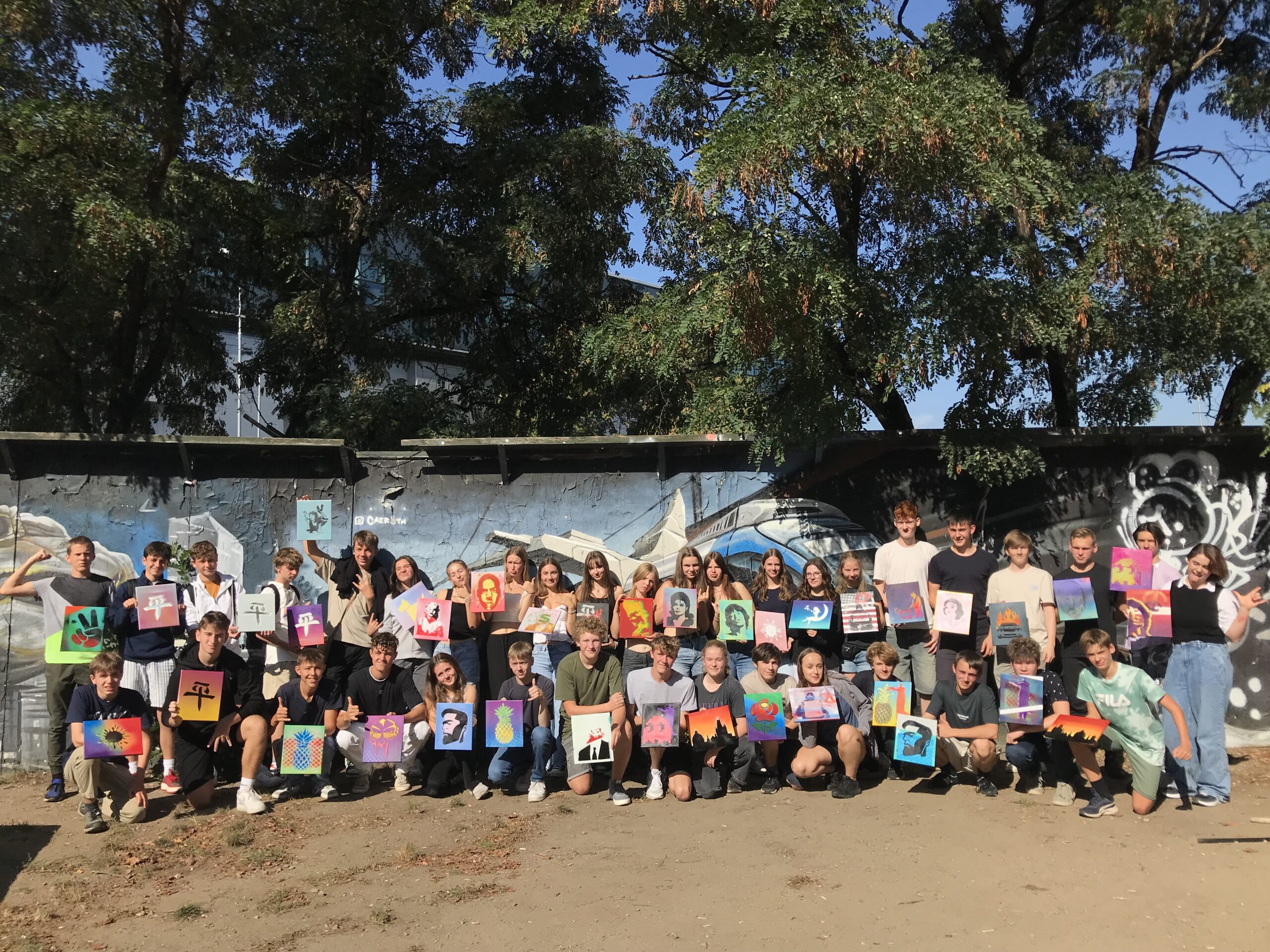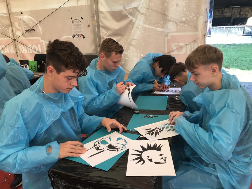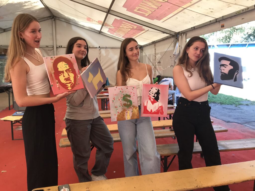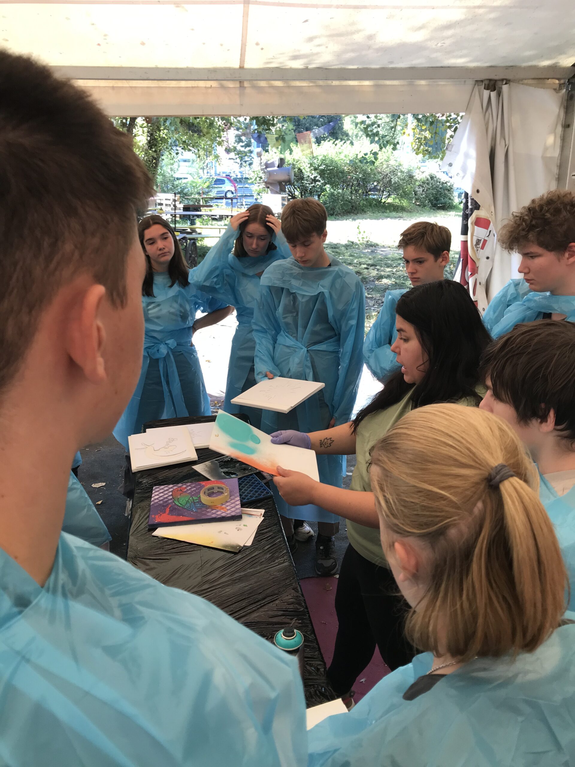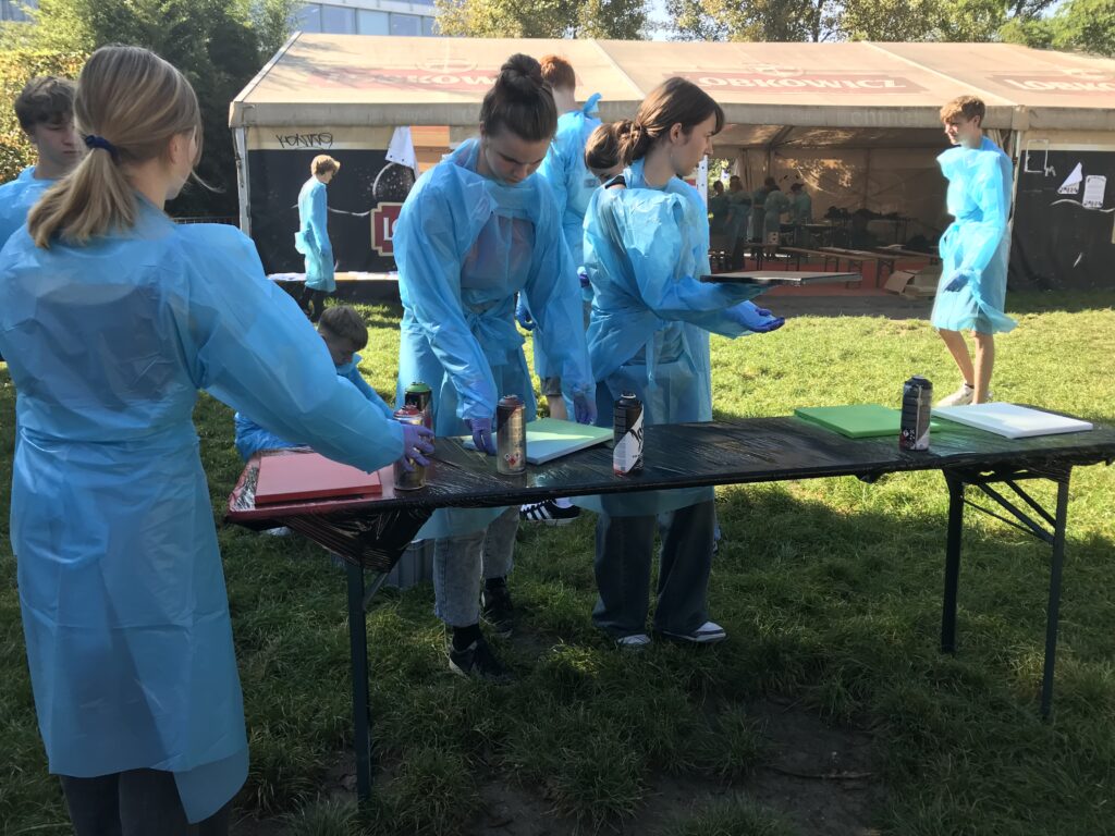 Am meisten gefallen hat mir der Street Art-Workshop, bei dem wir alle unser eigenes Kunstwerk erstellen konnten. Wir suchten uns eine Vorlage mit verschiedenen Motiven aus, diese haben wir ausgeschnitten und als Schablonen benutzt. Dann zeigte uns die Graffitikünstlerin Sany verschiedene Techniken für das Sprayen. Nun mussten wir nur noch die Schutzkleidung anziehen und konnten beginnen. ( Käthe)
