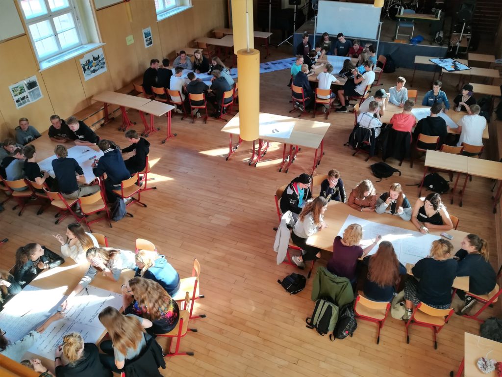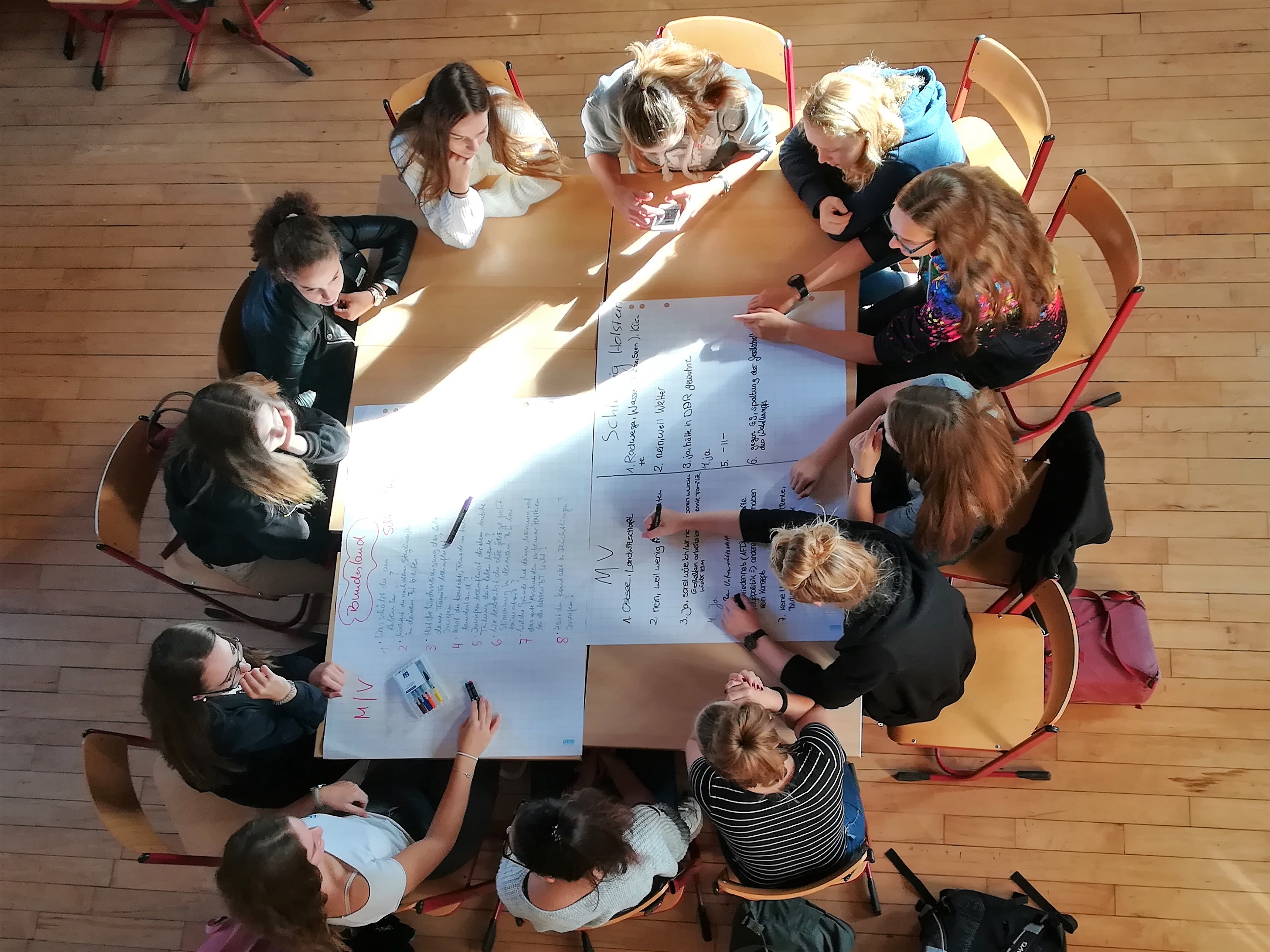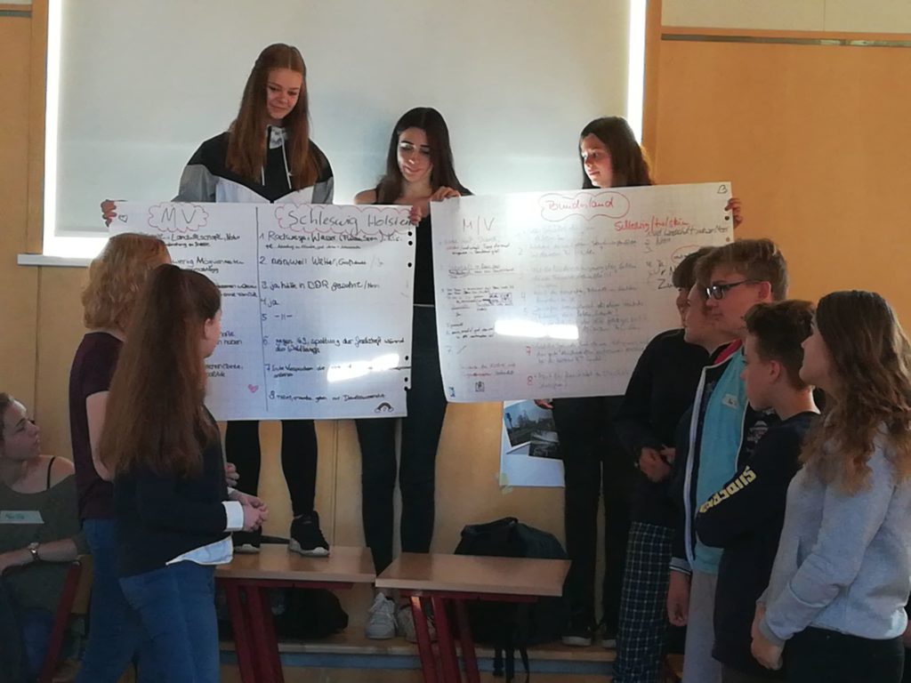Dort arbeiteten die Lübecker und Schönberger Schülerinnen und Schüler zum Thema „Deine Zukunft im Norden“. In Gruppen tauschten sie sich zu unterschiedlichen Fragen aus: Wie verbringst du deine Freizeit? Welche Mitbestimmungs- und -gestaltungsmöglichkeiten hast du an deiner Schule? Welche Ausbildungs- und Studienmöglichkeiten gibt es in deiner Stadt? Was schätzt du an deinem Bundesland? Wo und wie willst du in 10 Jahren leben? Inwiefern beeinflusst die Wiedervereinigung das Leben deiner Familie heute? Wie beurteilst du die politische Situation in deinem Bundesland? Welche Erwartungen hast du an die Europäische Union? Das sind nur einige Fragen, über die die Jugendlichen miteinander ins Gespräch kamen.