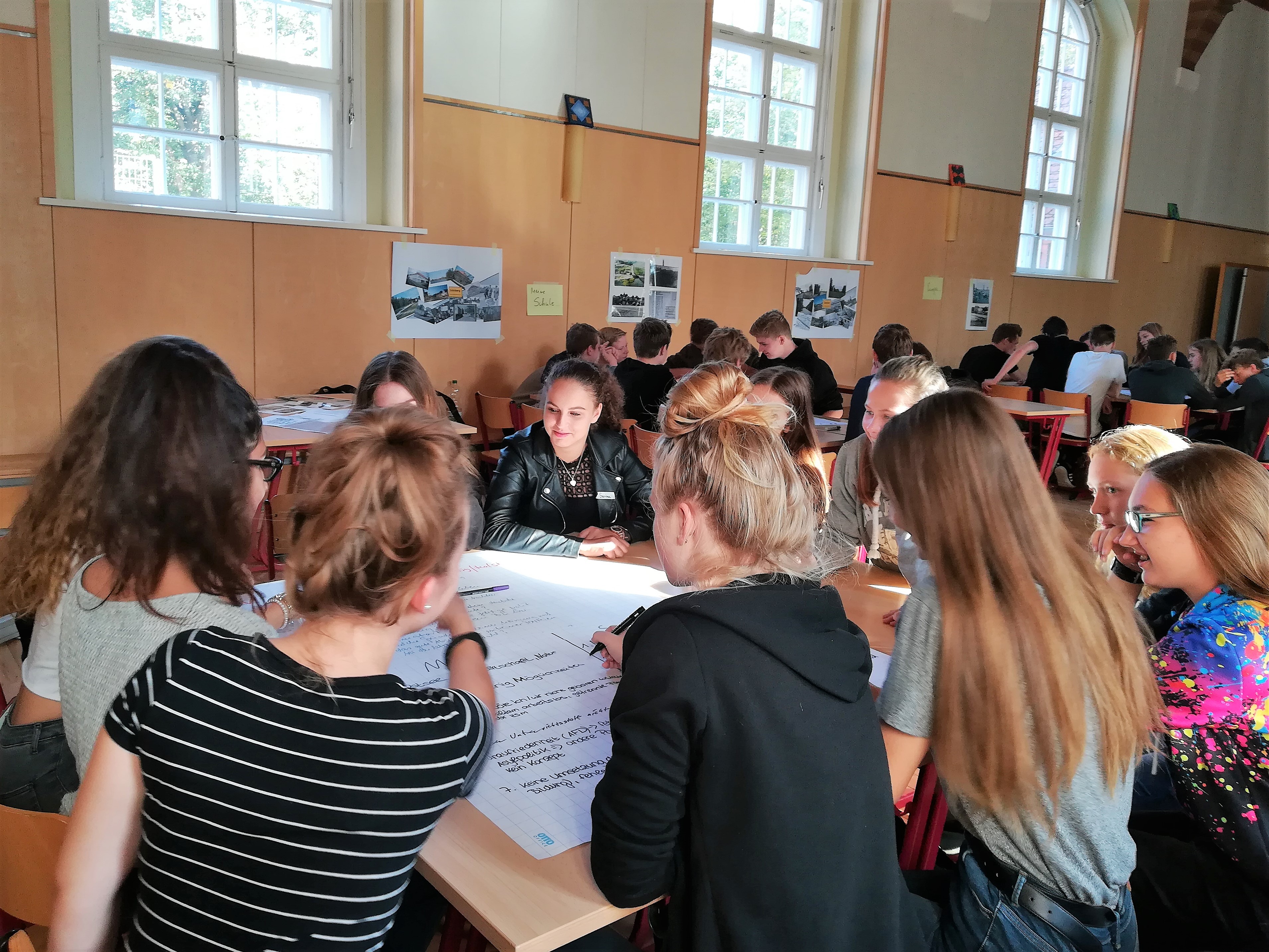 Ihre Antworten notierten die Gruppen auf Flipchartbögen, bevor sie zum nächsten Tisch und Thema wechselten und dort ihre Antworten ergänzten. Nachdem sie alle Stationen durchlaufen hatten, präsentierten die Jugendlichen die Ergebnisse.