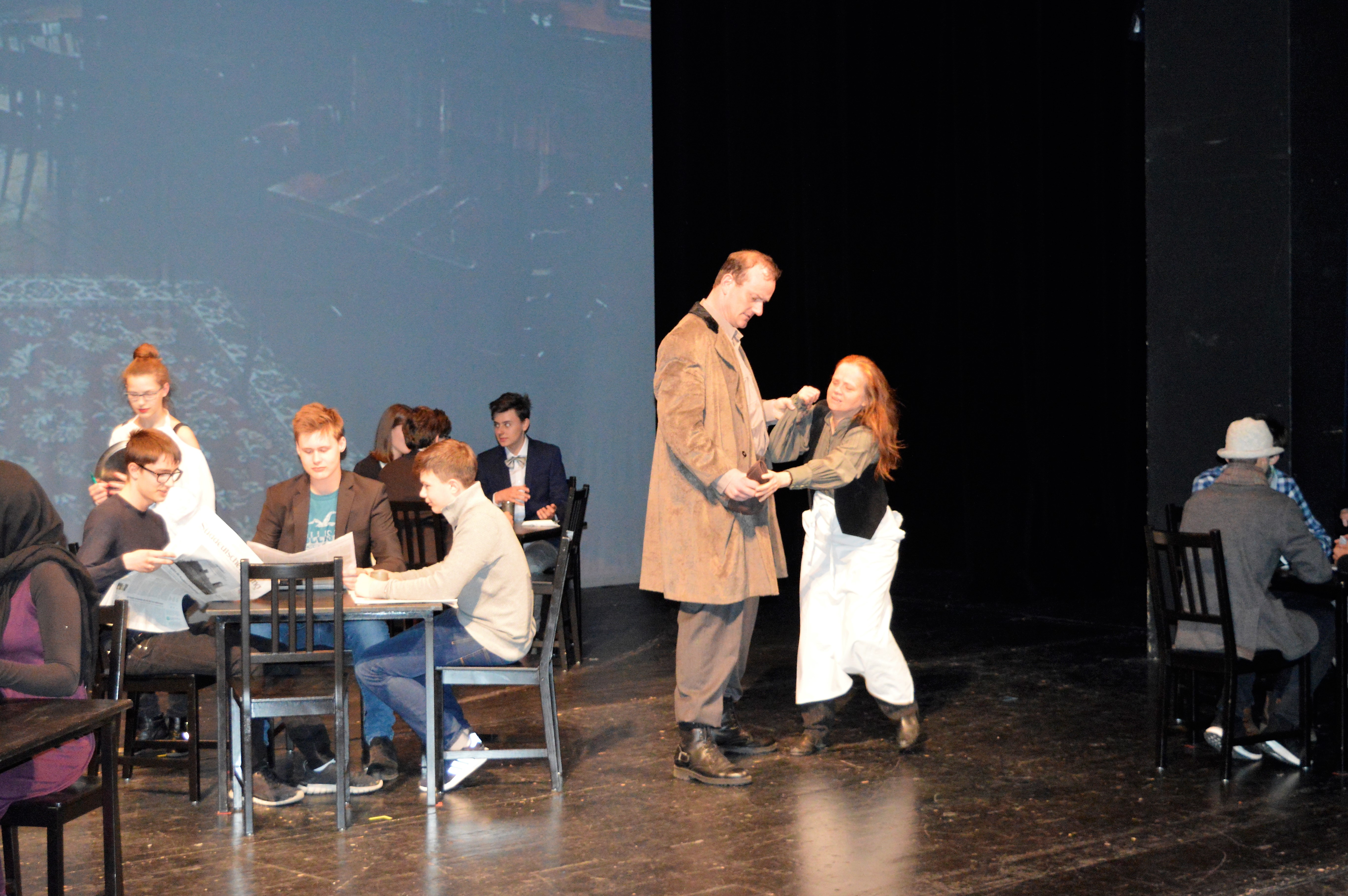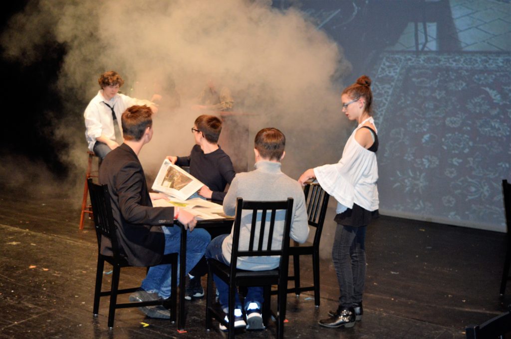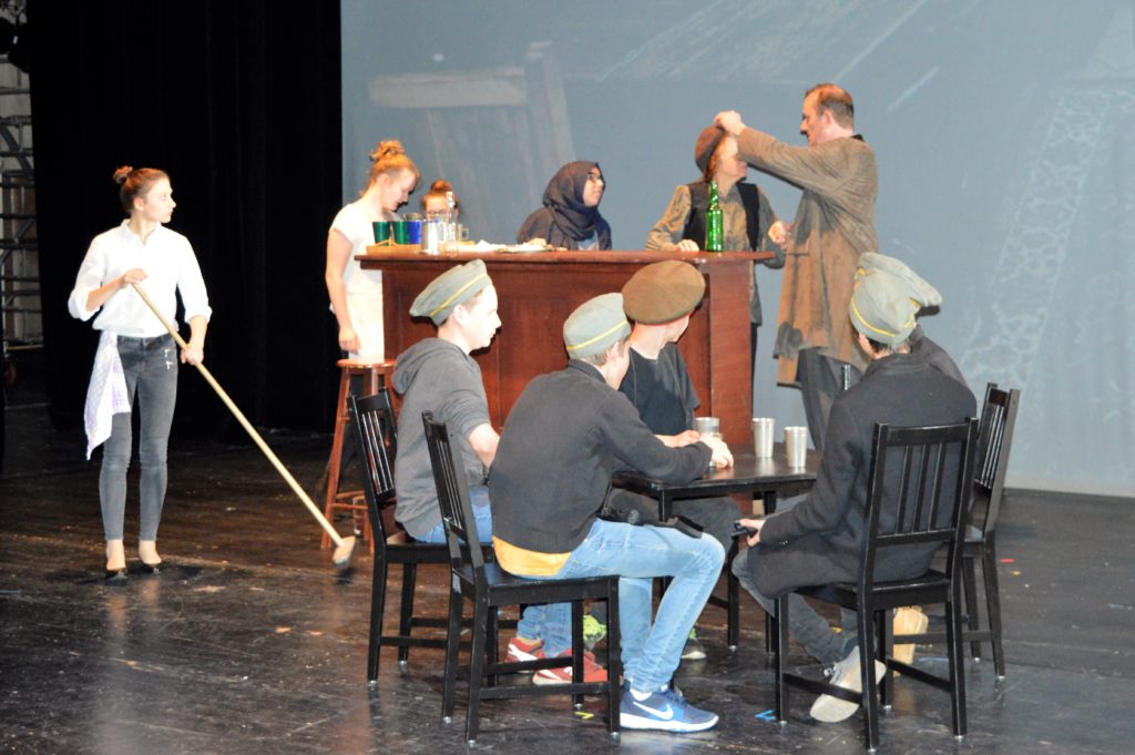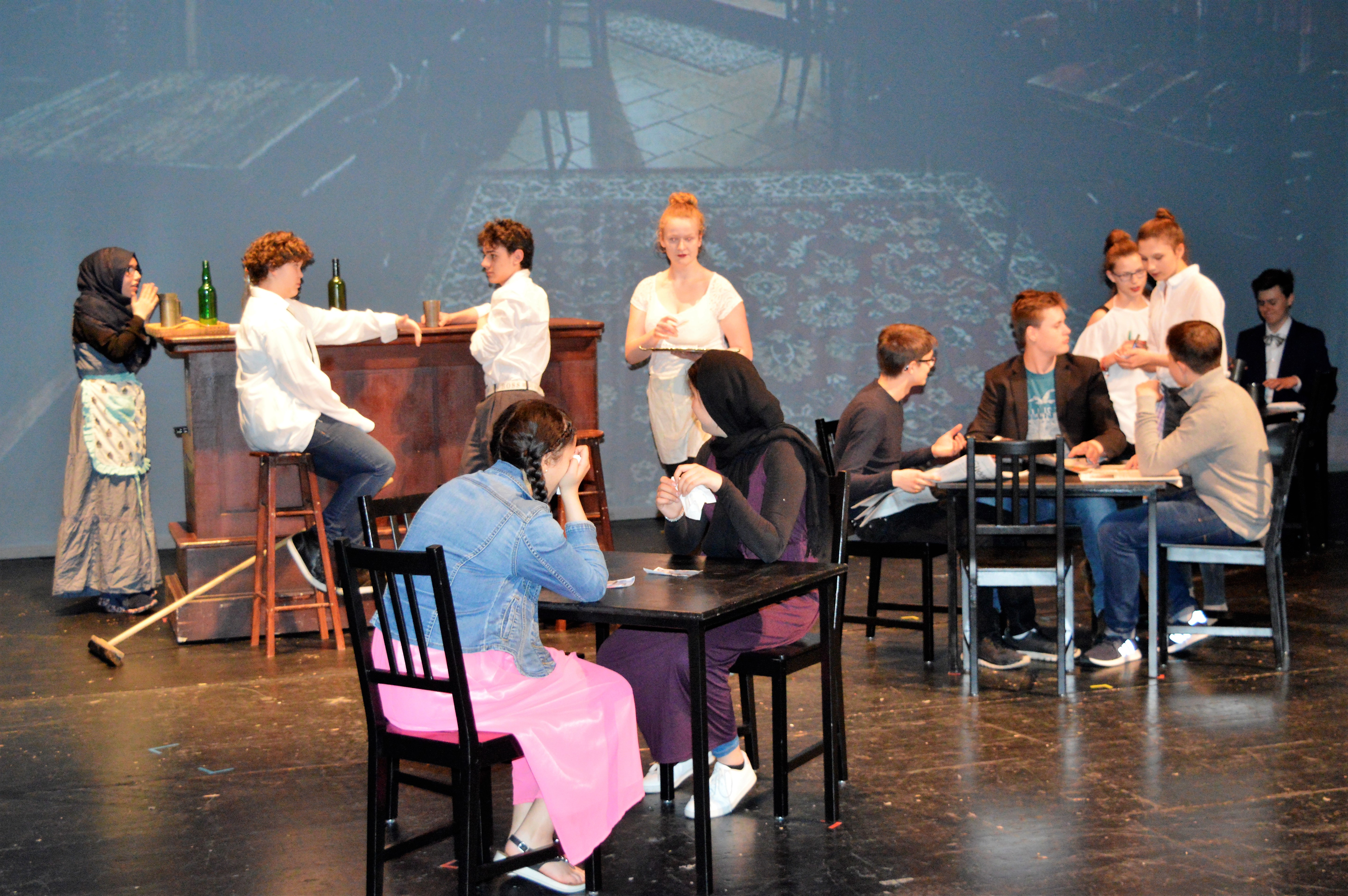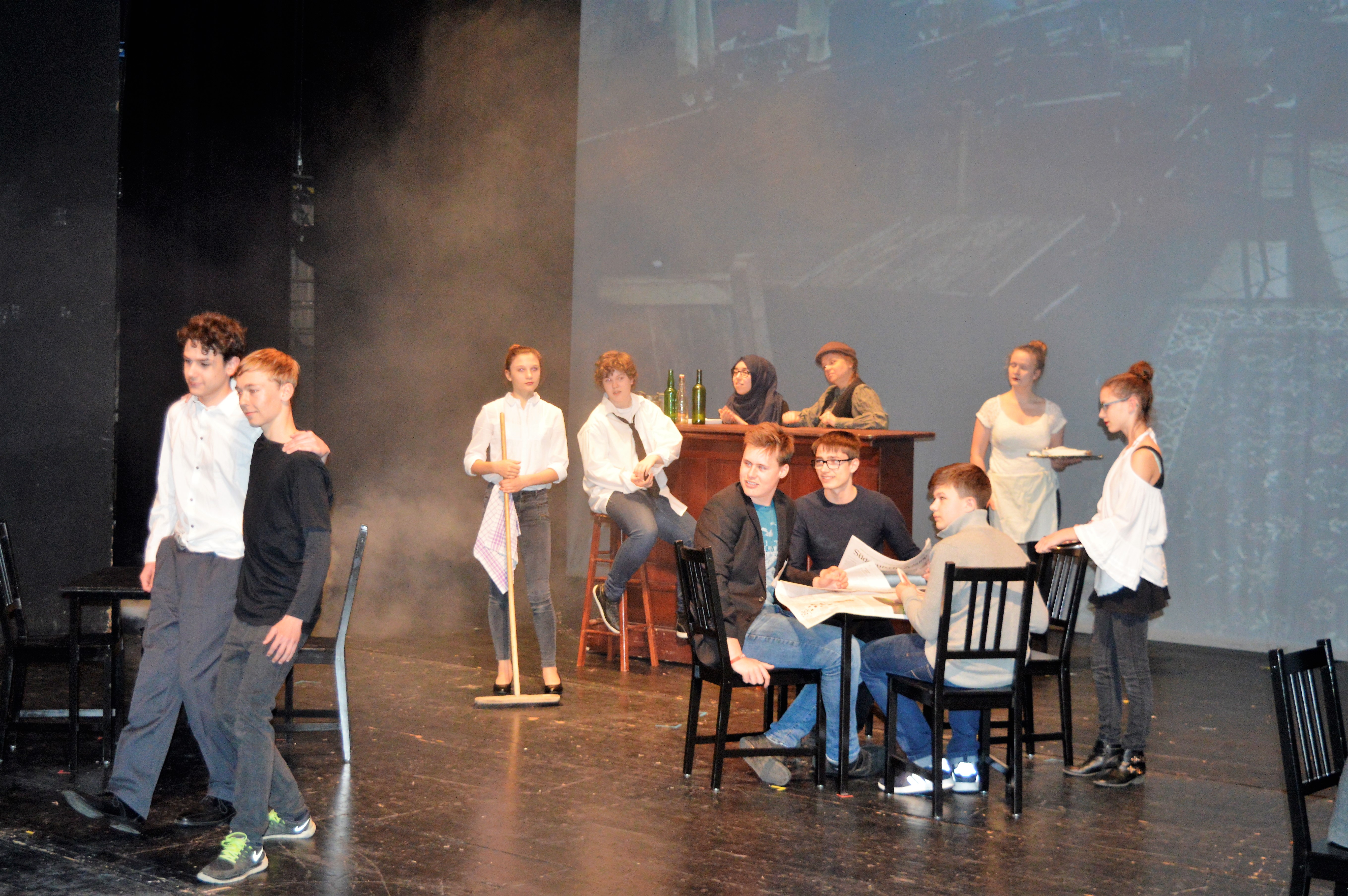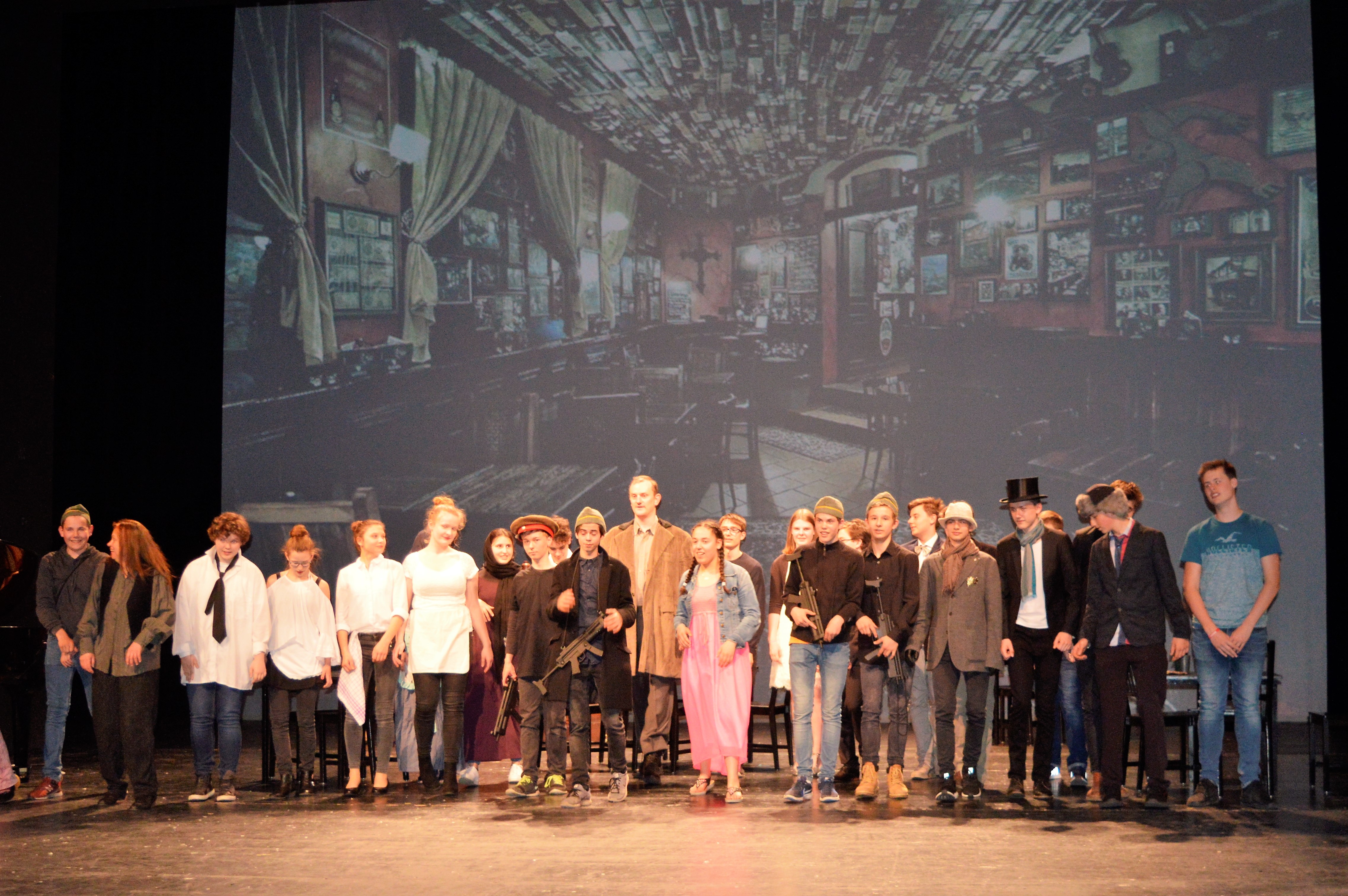 Zwei Tänzer betreten das Lokal. Das Publikum auf und vor der Bühne klatscht im Takt zu ihrer Darbietung. Ort des Geschehens ist eine russische Kneipe während des Zweiten Weltkriegs. Das ist die Eröffnungsszene der Operninszenierung, die die Schülerinnen und Schüler der Klasse 9b am Dienstag, den 24. April beim Finale des Opernwettbewerbs auf die Bühne brachten.