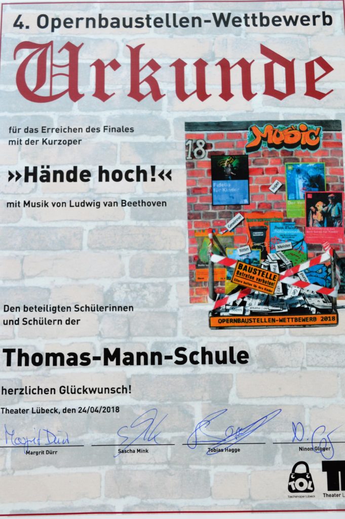 Auch wenn der Sieg knapp verfehlt wurde – Grund , stolz zu sein, haben die Schülerinnen und Schüler allemal. Die Jury lobte, den Opern würdigen Plot mit falscher Identität, Liebe, Krieg und Opfertod des Helden, die sprachliche Gestaltung der Libretti sowie die Tatsache, dass alle Schülerinnen und Schüler auf der Bühne in unterschiedlichsten Rollen gemeinsam agiert hatten. Neben einer Urkunde konnten die Klassensprecher Freikarten für „Die Zauberflöte“ am Lübecker Theater in Empfang nehmen.